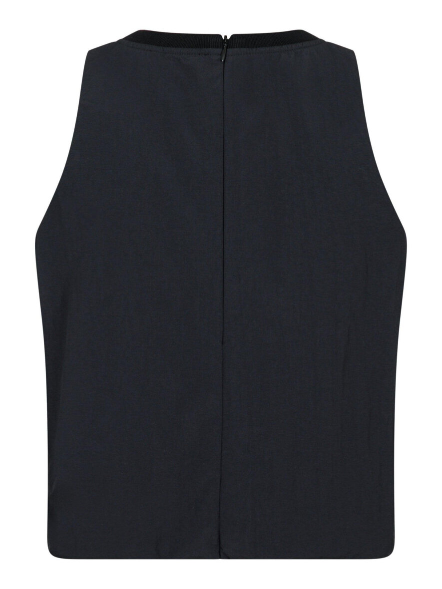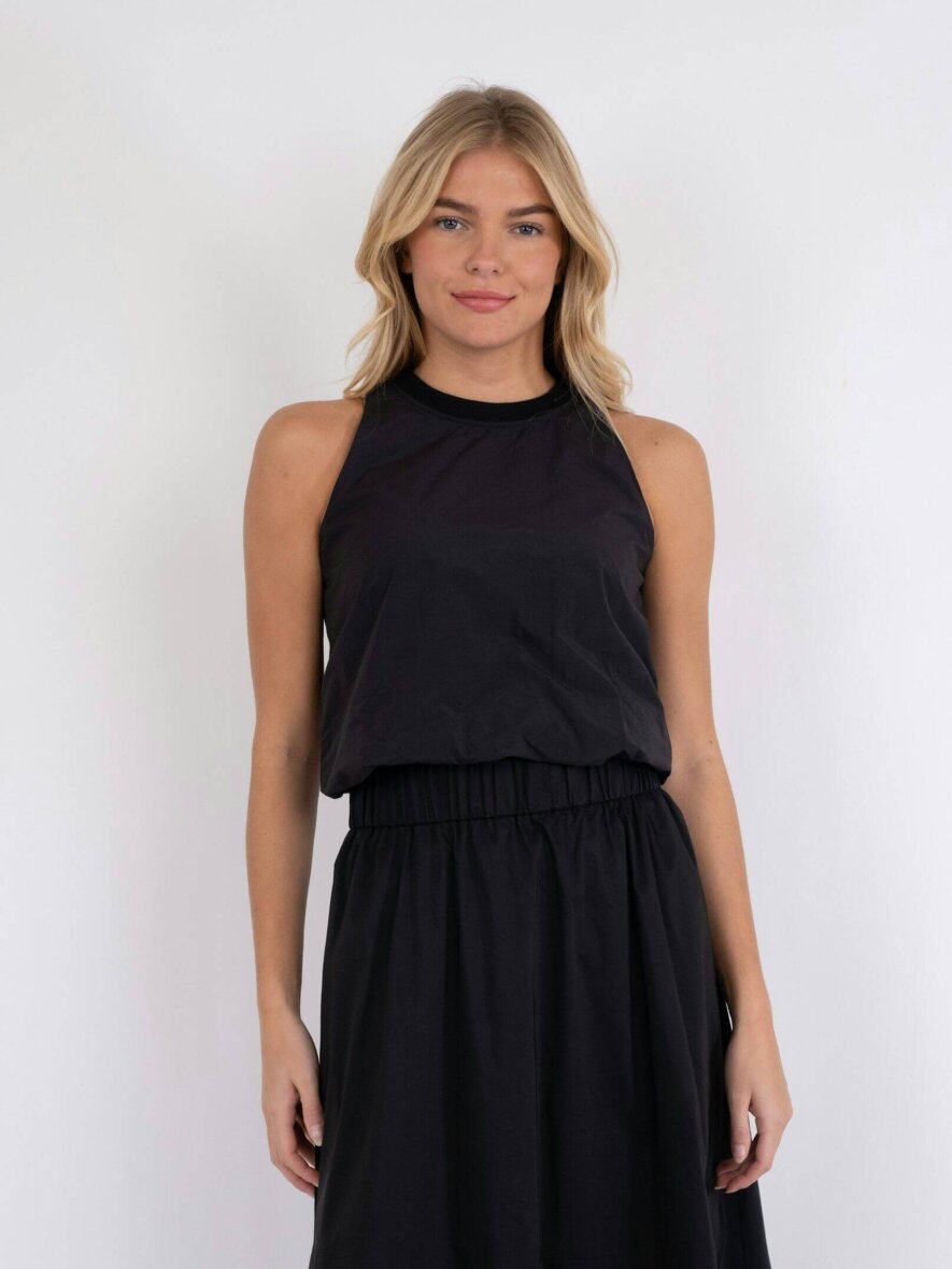 Smart sort top fra Neo Noir. Ivy Poplin toppen er lavet i en cropped længde. Toppen er med rund hals med ribkant og ærmeløs. Toppen lukkes med en skjult lynlås bagpå. Toppen er med skjult elastik i taljen, hvilket giver en flot ballon effekt når man har toppen på.