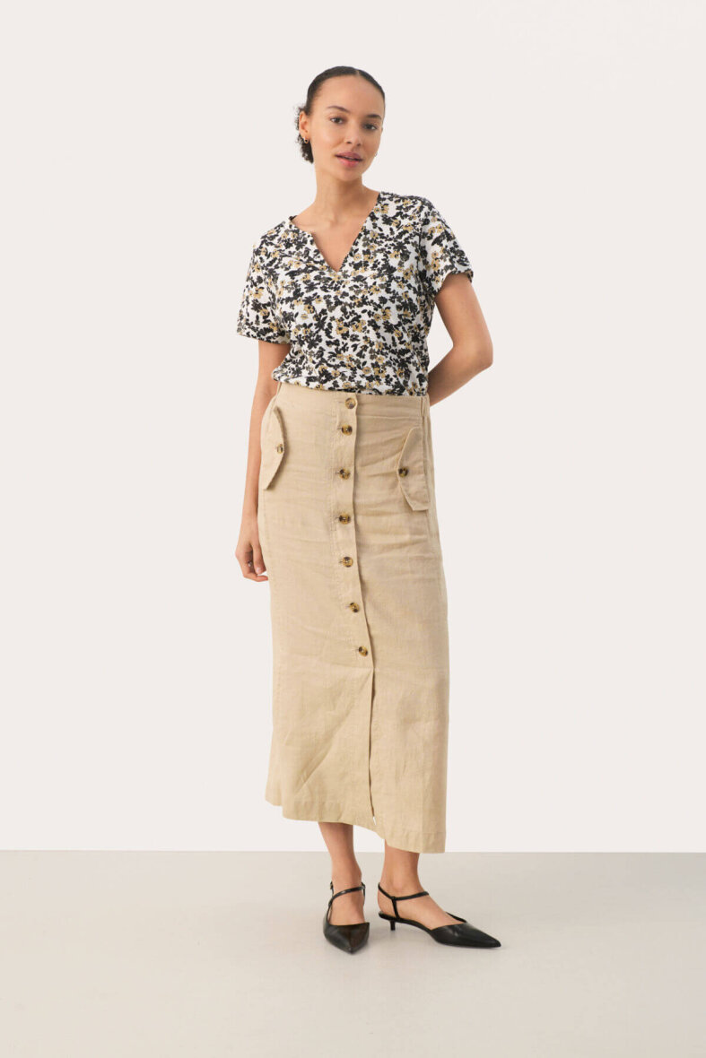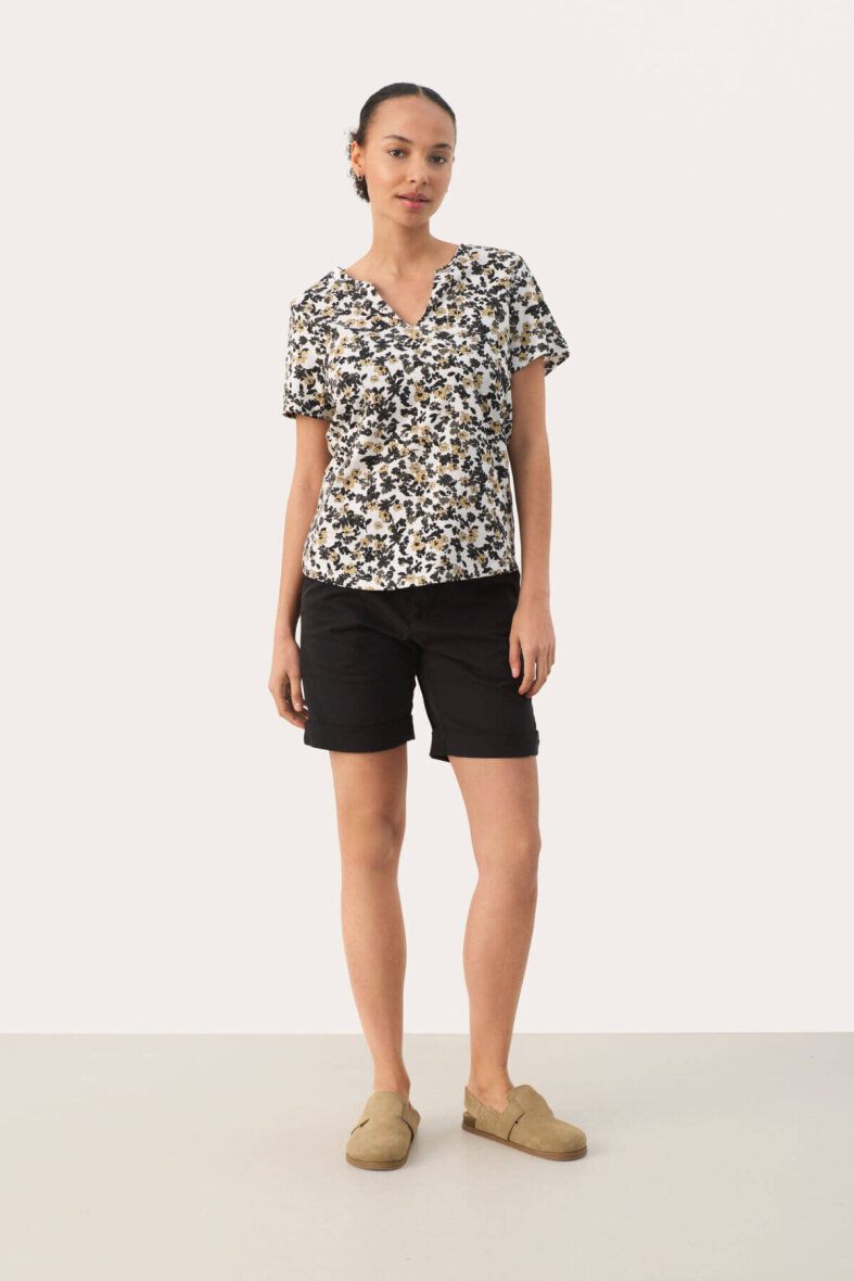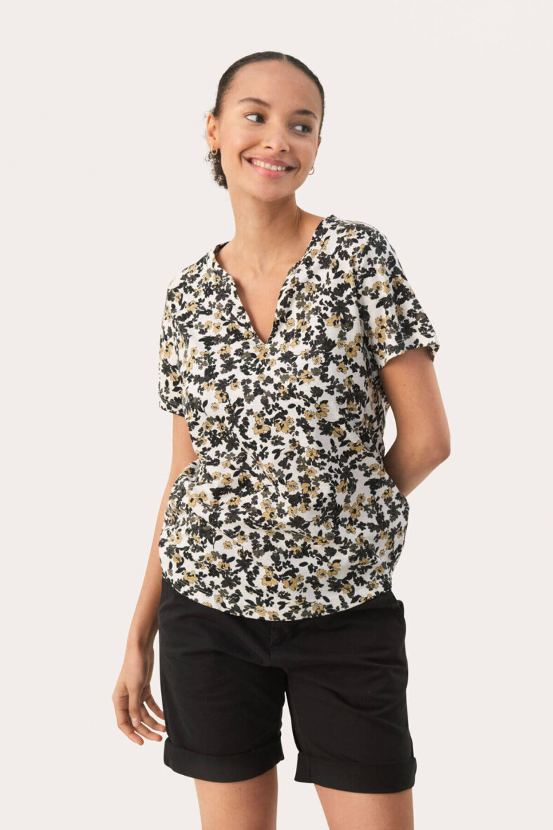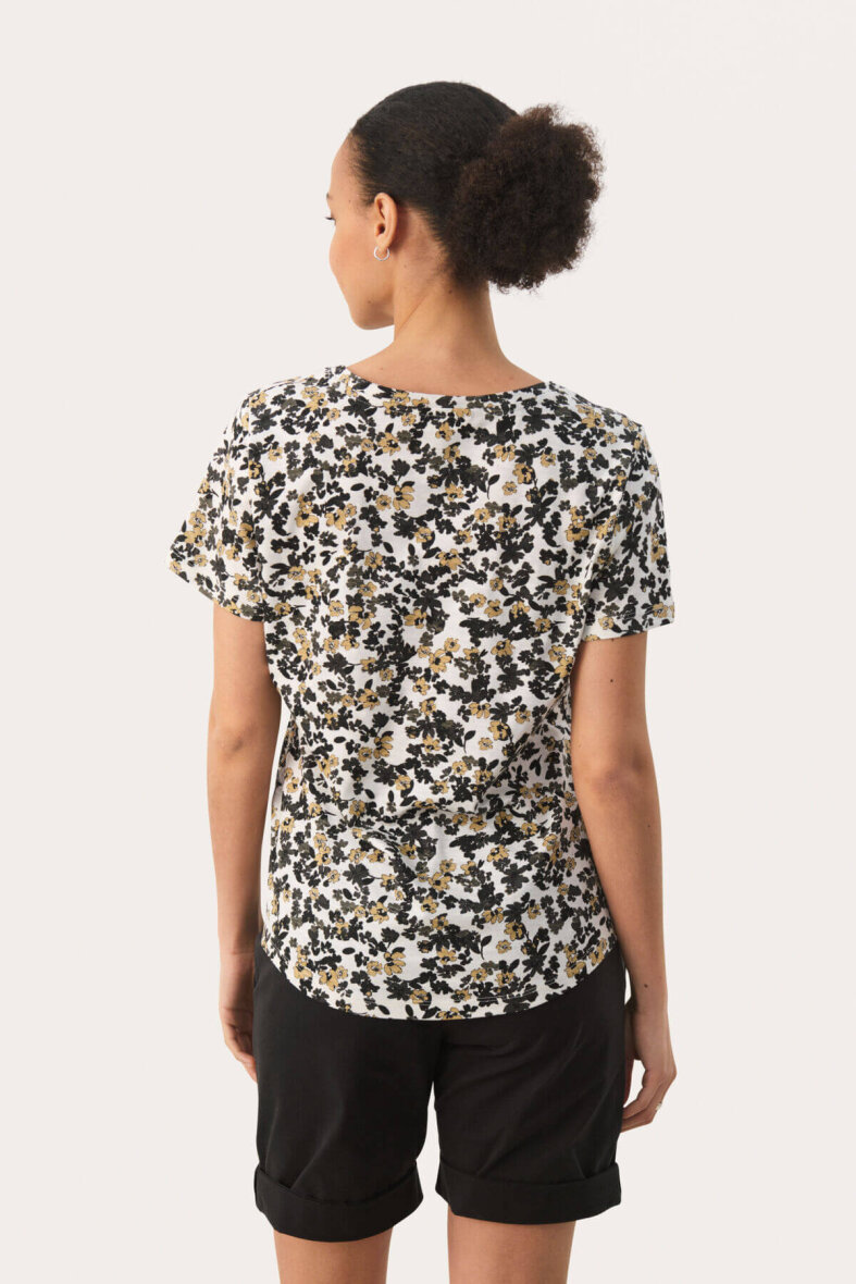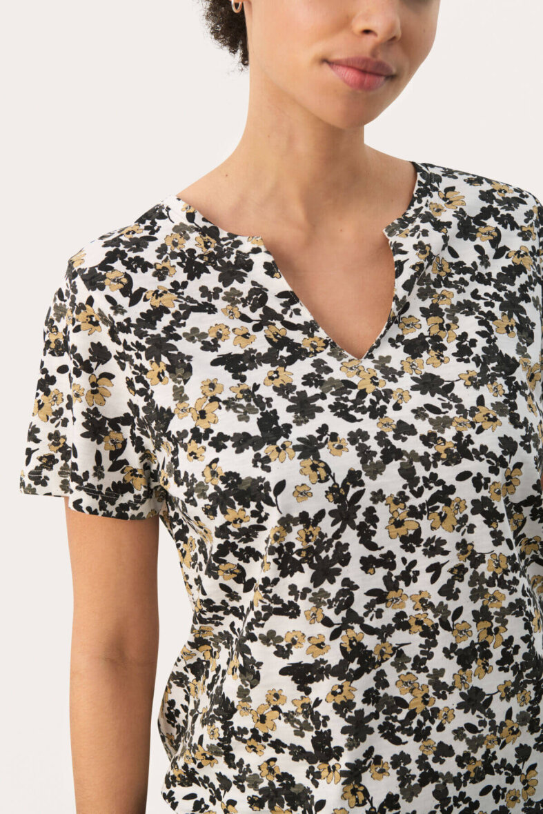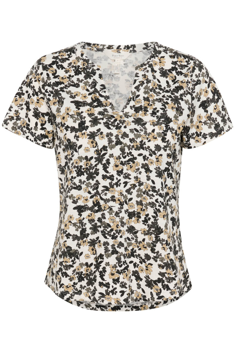 Sød og feminin blomstret t-shirt fra Part Two. Den hvide t-shirt er lavet i et smukt blomsterprint i brune og sorte nuancer. T-shirten er med en v-halsudskæring og korte ærmer.