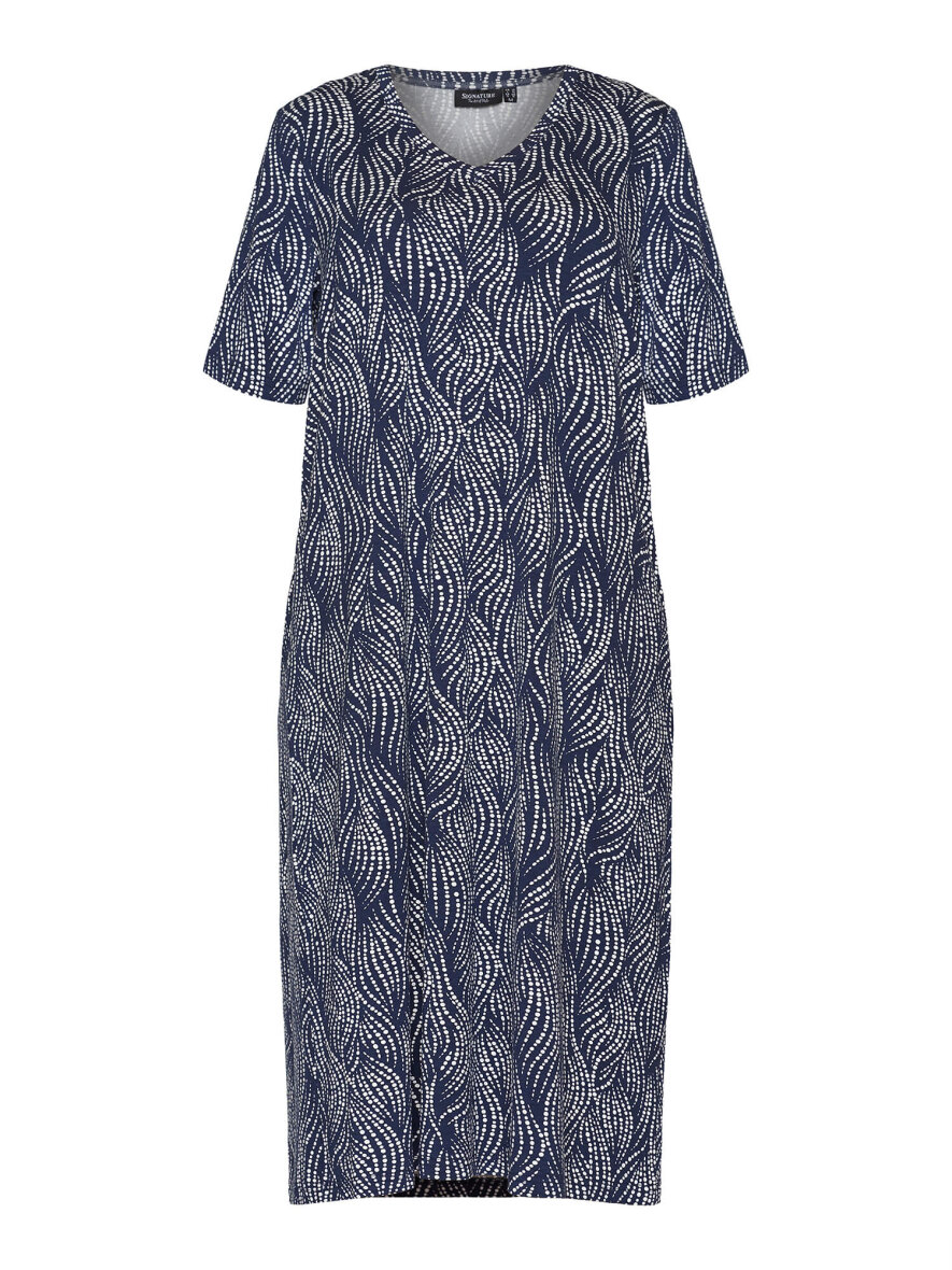 Flot lang kjole fra Signature. Kjolen er lavet i en flot navy blå farve med et hvidt mønster, som passer perfekt til forår og sommersæsonen.
