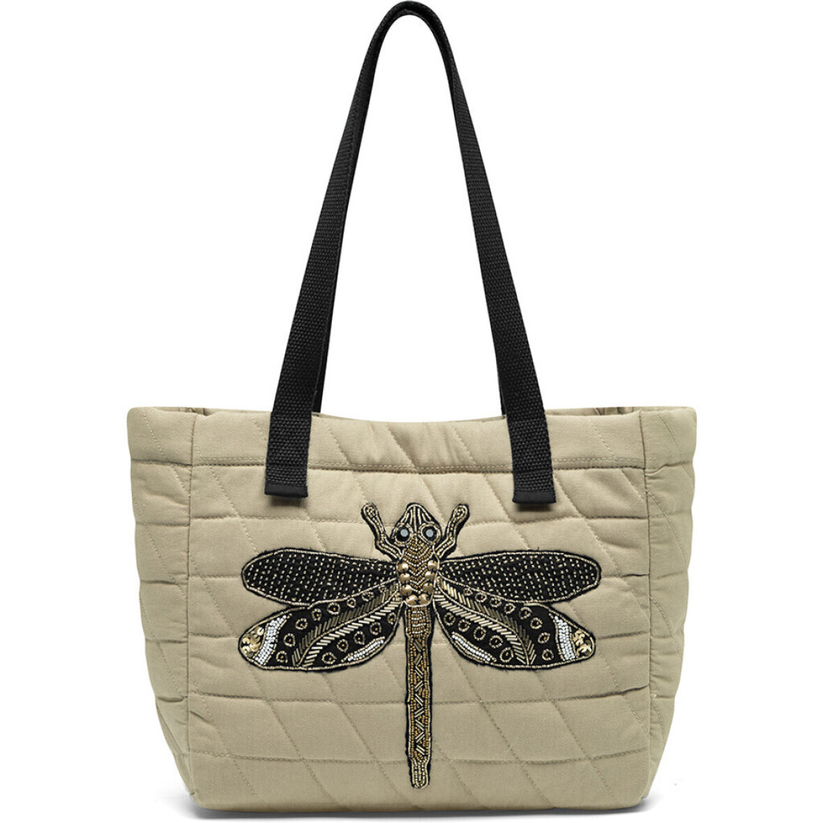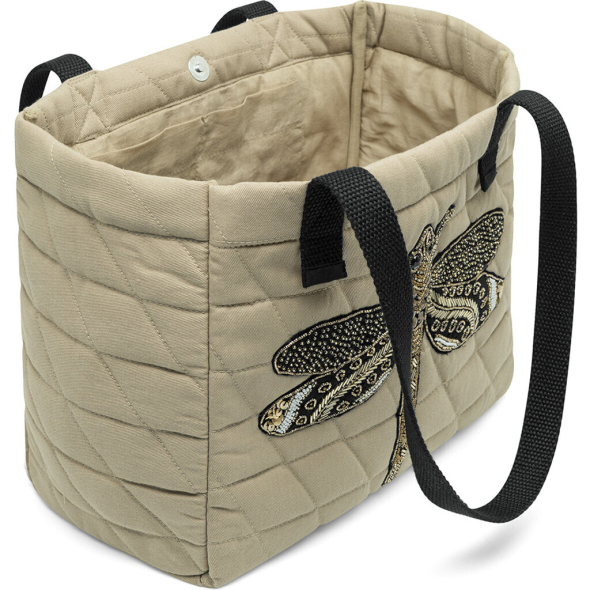Flot skuldertaske i en lys sandfarve fra Depeche. Tasken er lavet i et flot quiltet design med en dekorativ guldsmed med perler og pailetter som giver struktur og et feminint touch til tasken.