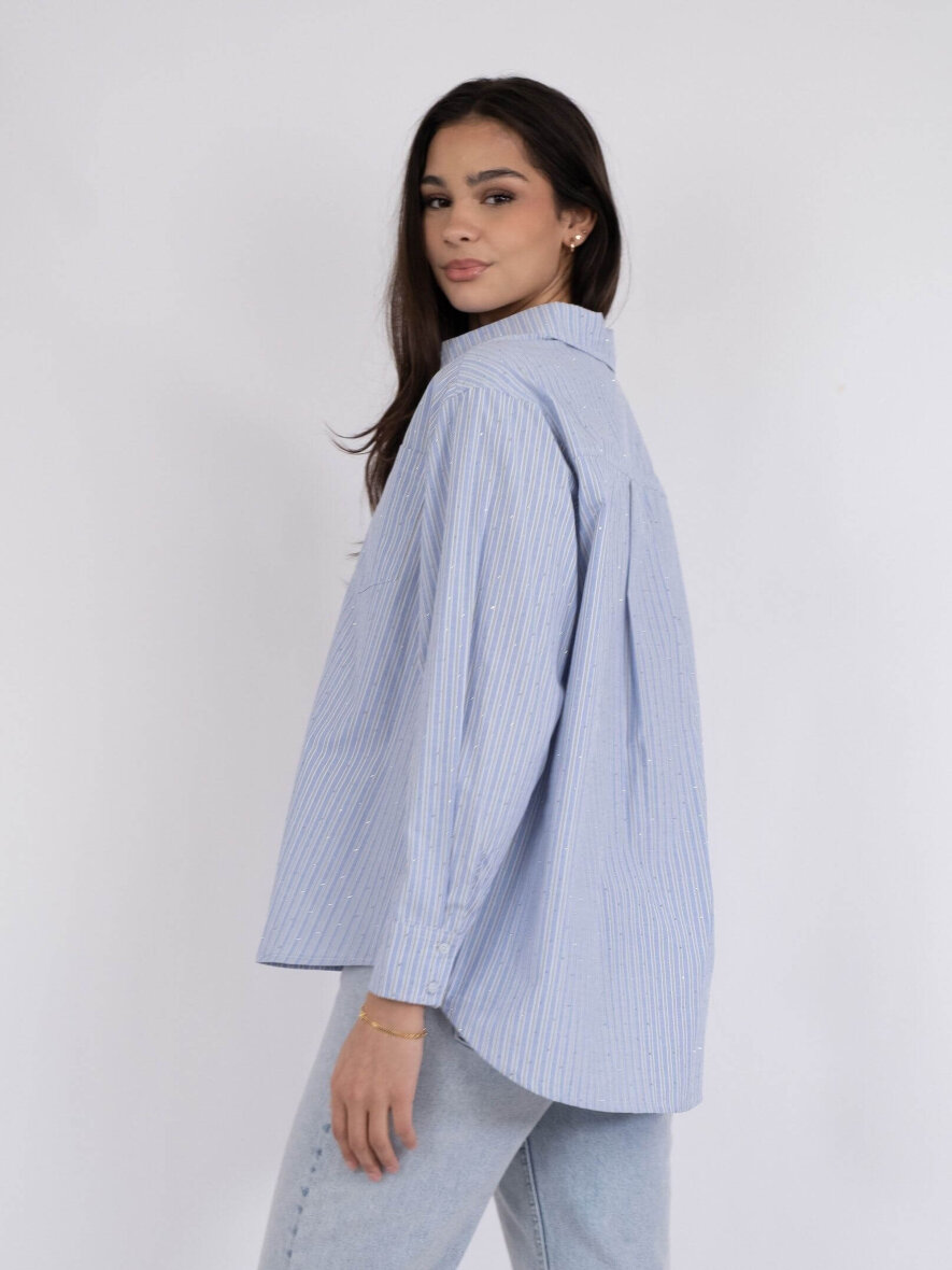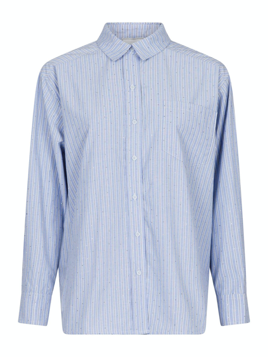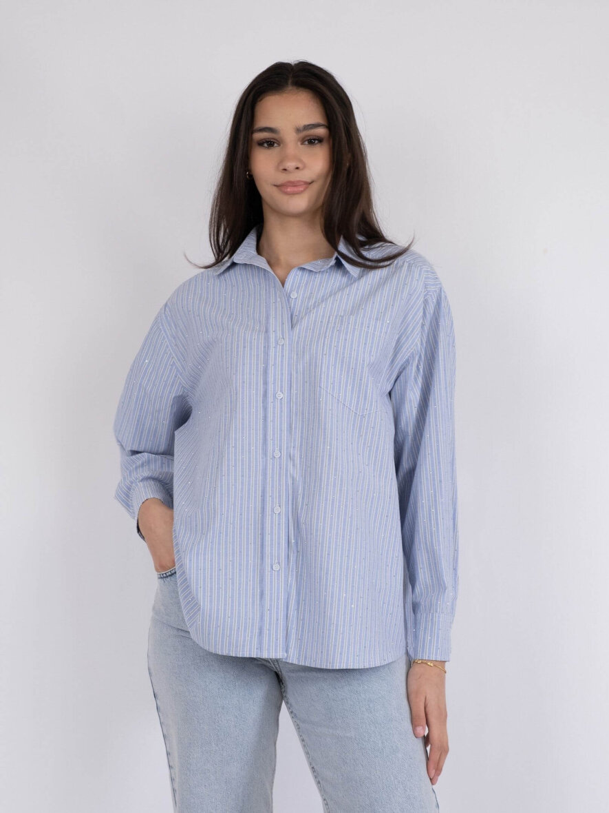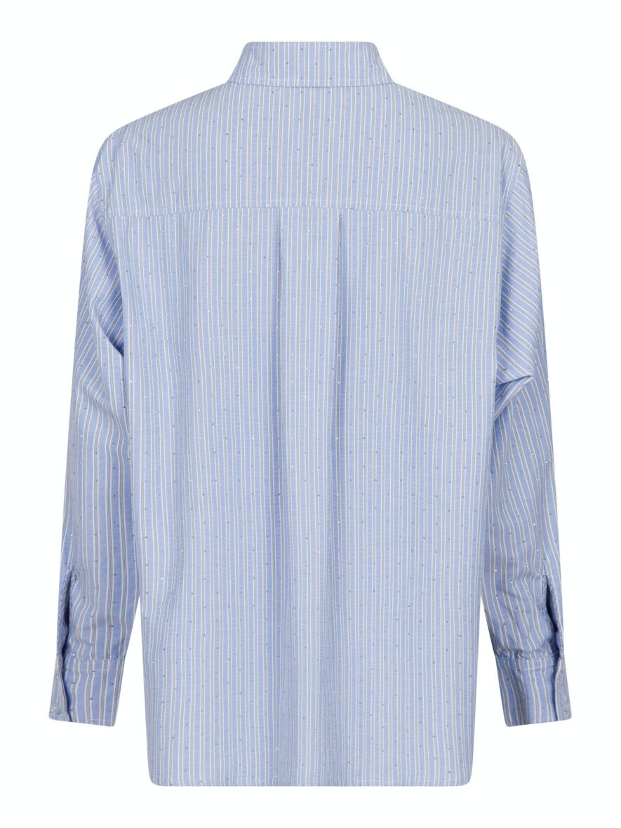 Cool skjorte med de fineste similisten fra Neo Noir. Skjorten er lavet i et flot stribet design med smukt dekoreret sten, som giver et feminint touch. Skjorten er med krave og gennemgående knapper foran. Skjortens lange ærmer med manchet knapper. Skjorten er med en flot afrunding.