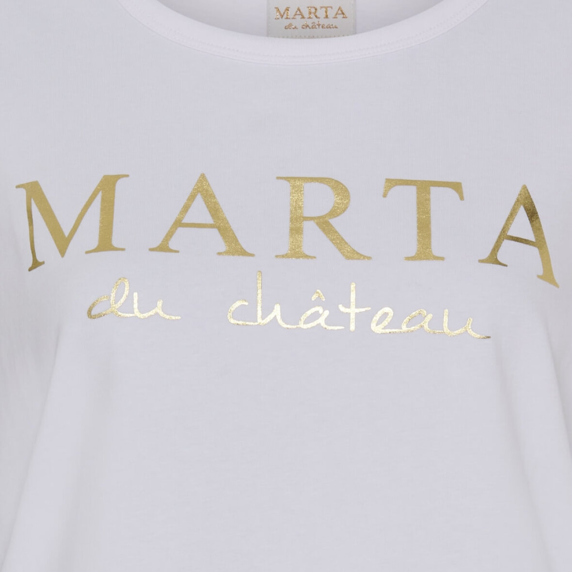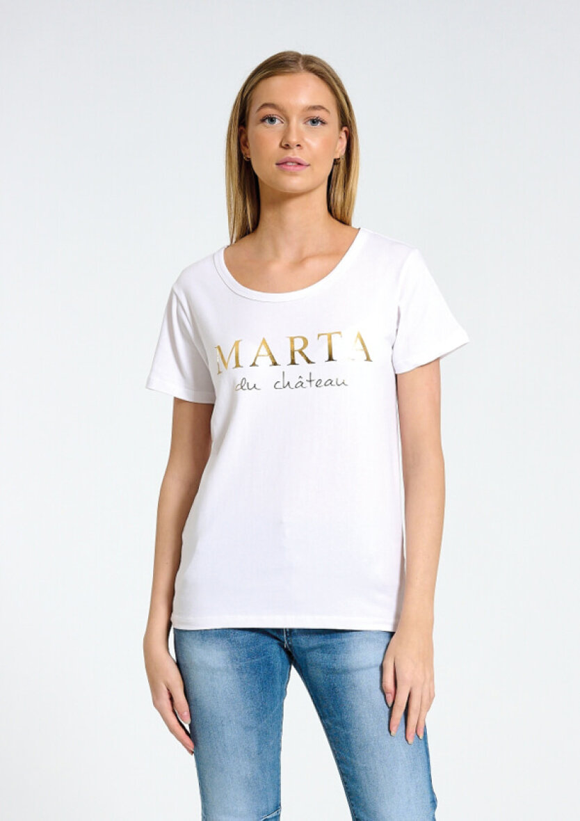 Skøn hvid t-shirt med tryk fra Marta Du Chateau. T-shirtens tryk er virksomhedens navn trykt med guld skrift.