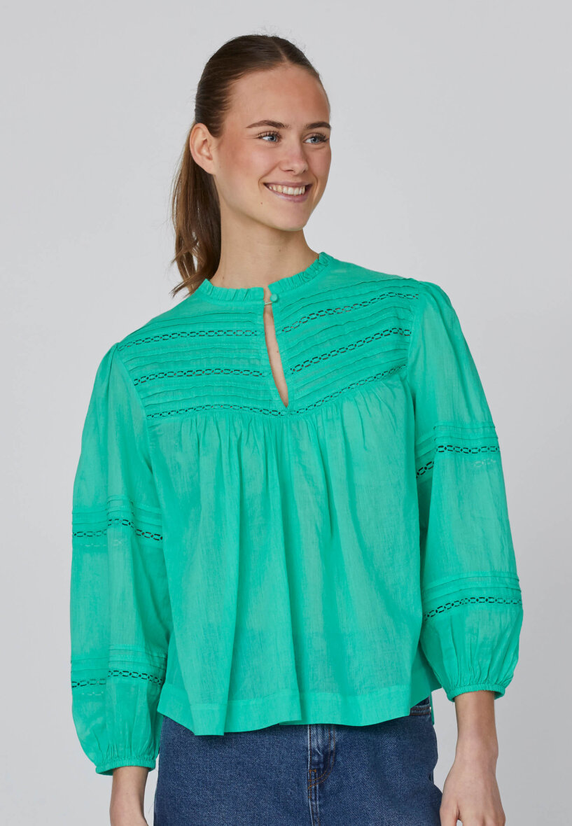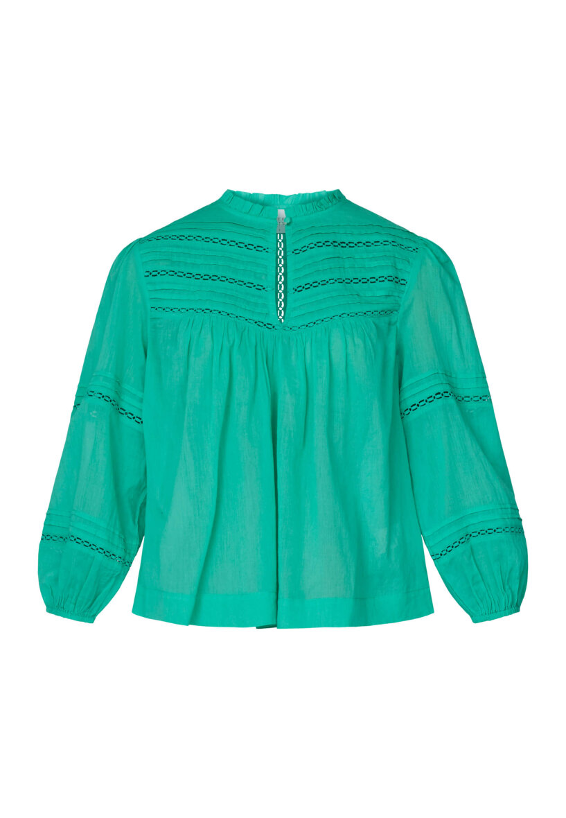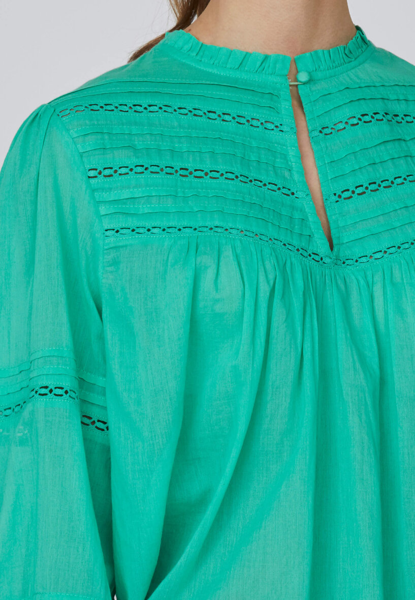Blusen er med fine små læg samt hullet design på den øverste del af blusen samt ærmer, hvilket giver et feminint udtryk.