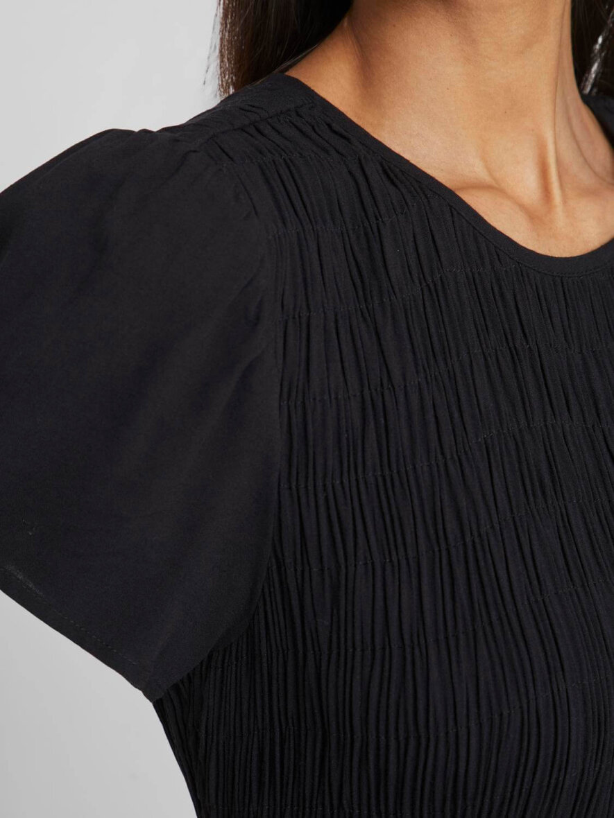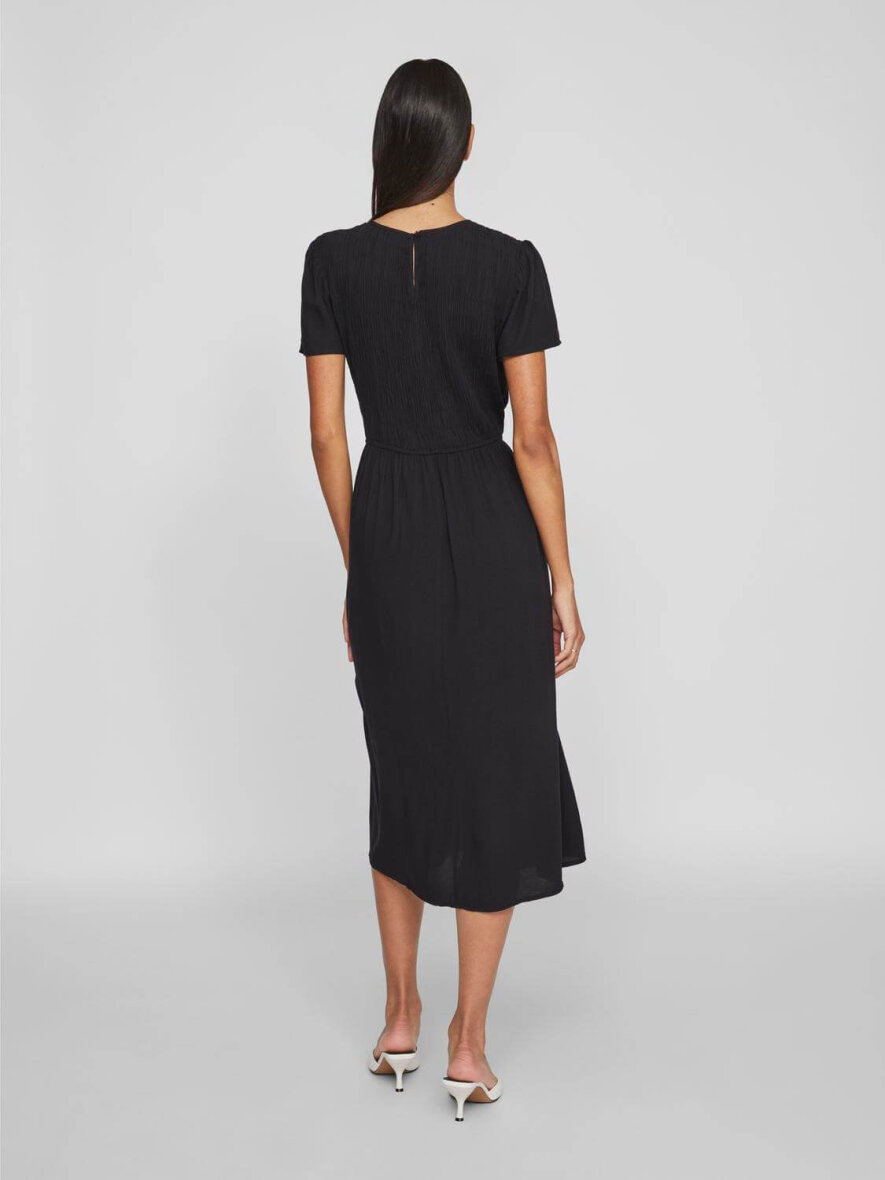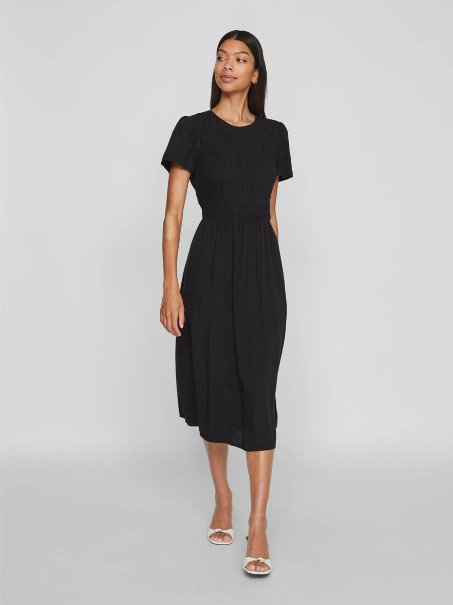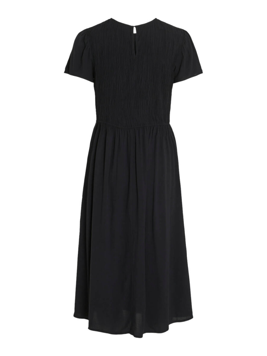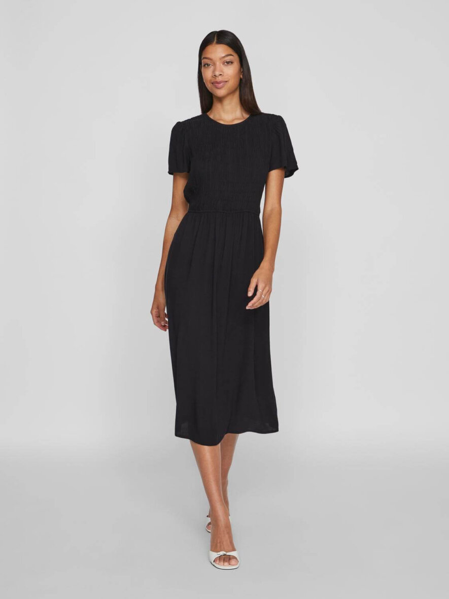 Super sød mellemlang kjole fra VILA. Den sorte kjole er designet med et bredt smock stykke på den øverste del af kjolen. Kjolen er tilmed med elastik i taljen, hvilket giver en flatterende facon når man bærer kjolen.