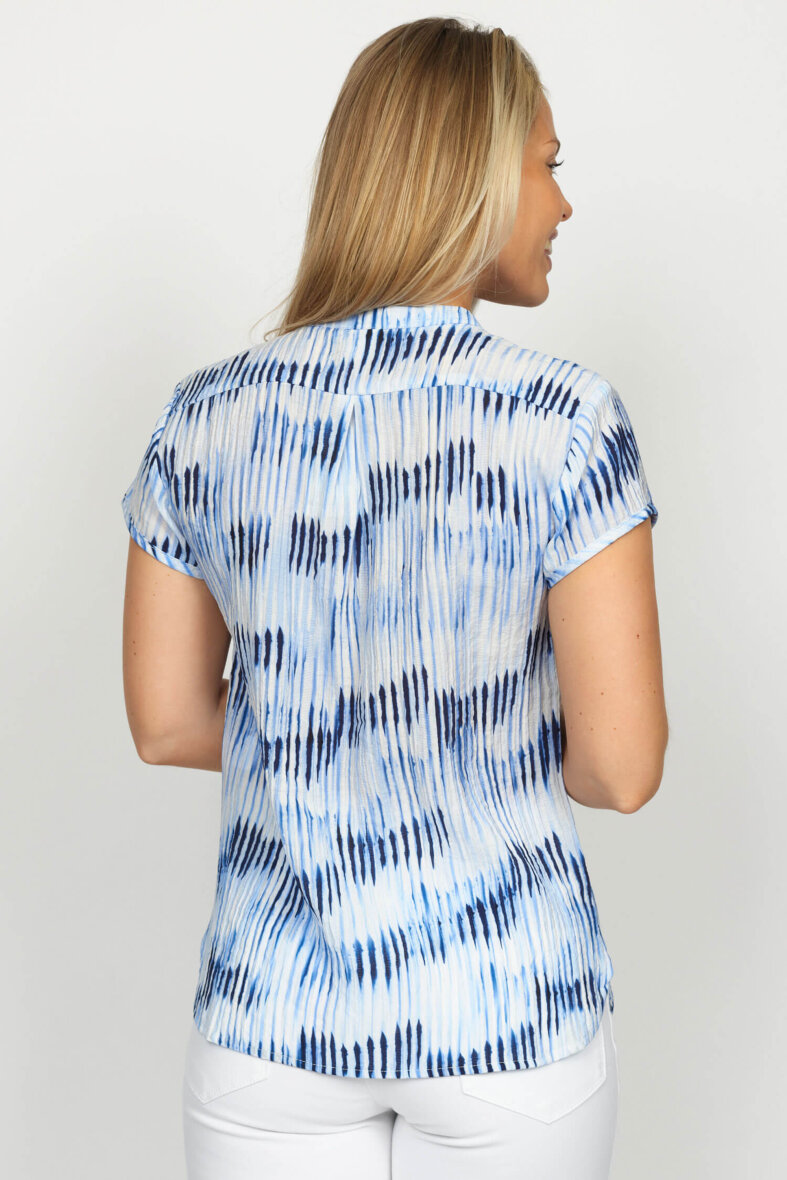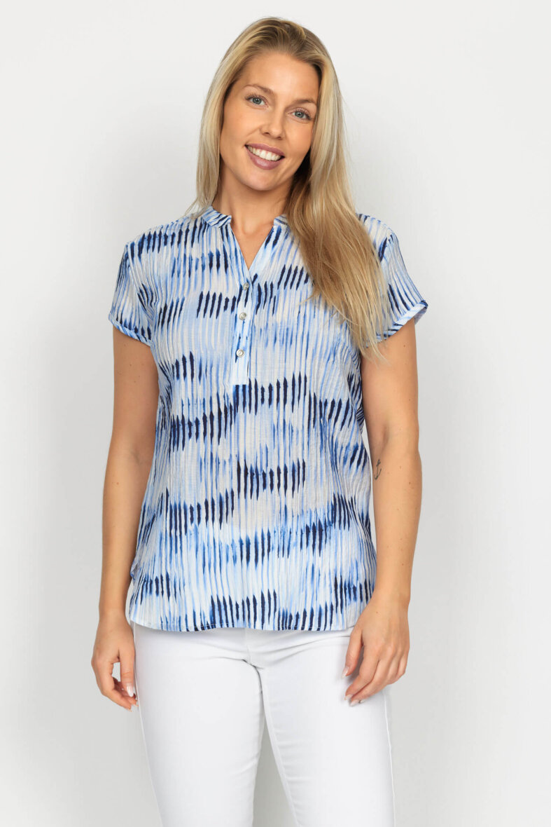 Flot og feminin bluse fra 2-biz. Beate blusen er designet i et flot grafisk print i blå nuancer, som passer perfekt til sæsonen. Blusen er designet i en let plissé effekt, hvilket giver struktur i stoffet.