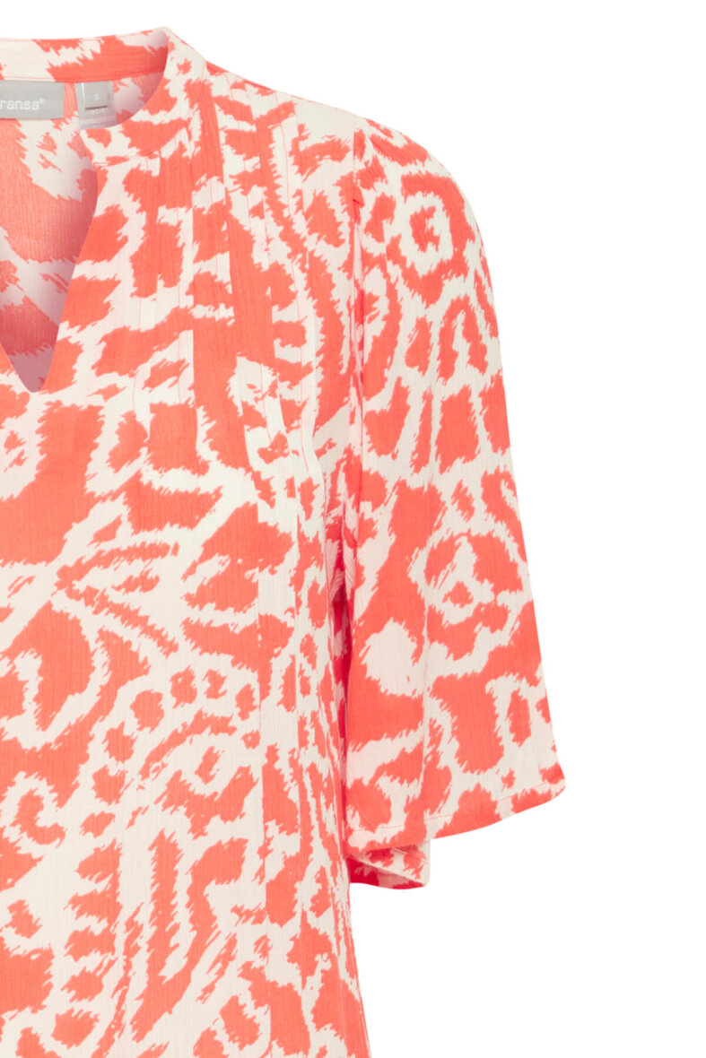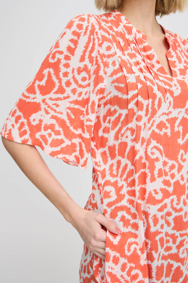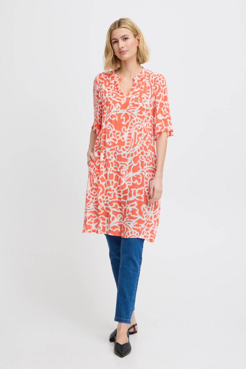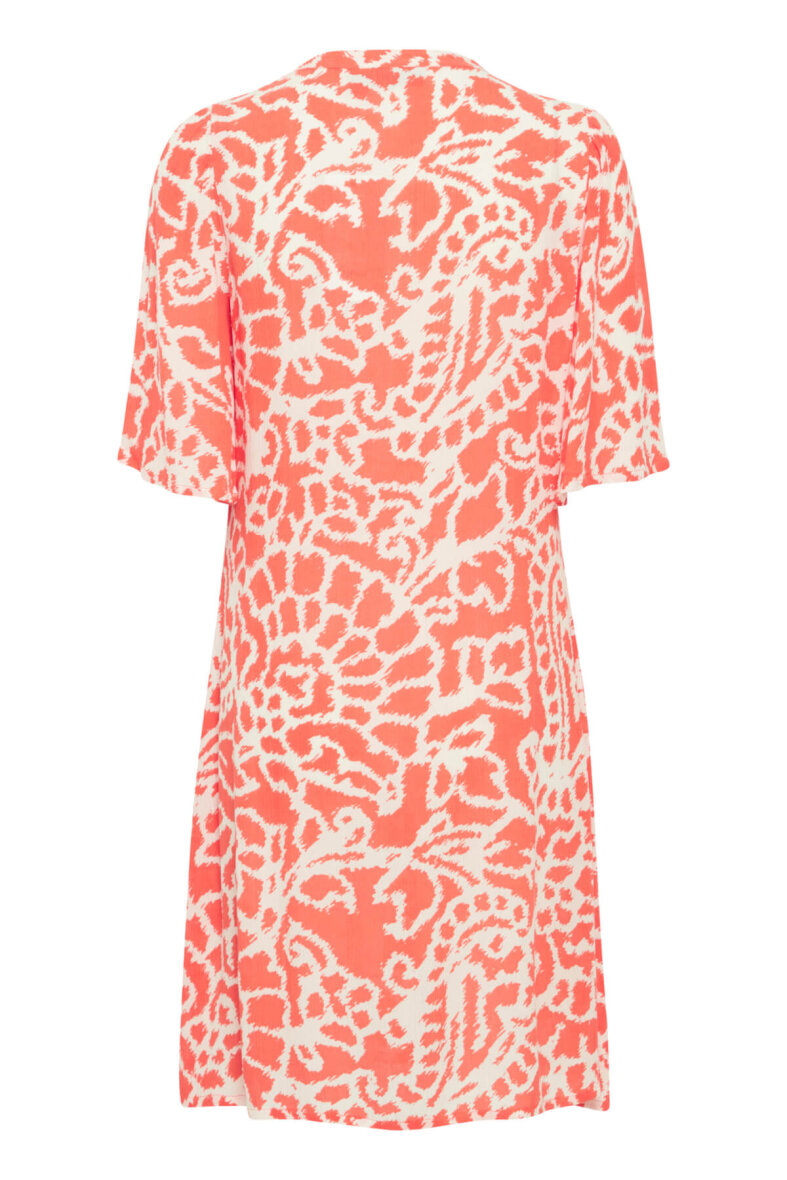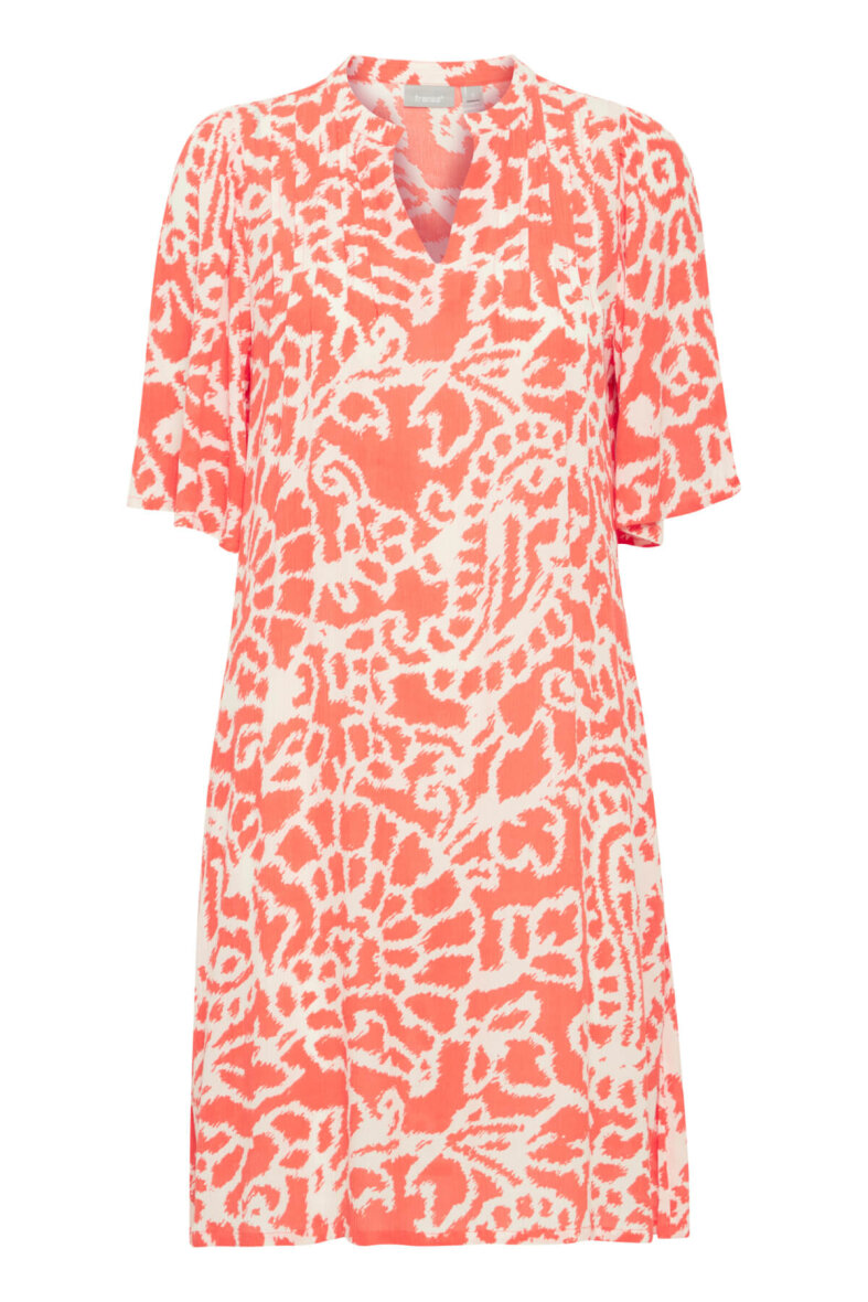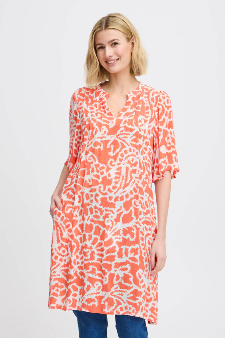 Flot og feminin orange kjole i et flot grafisk print fra FRANSA. Den fine orange Miria kjole er lavet en lækker 100% viskose kvalitet.