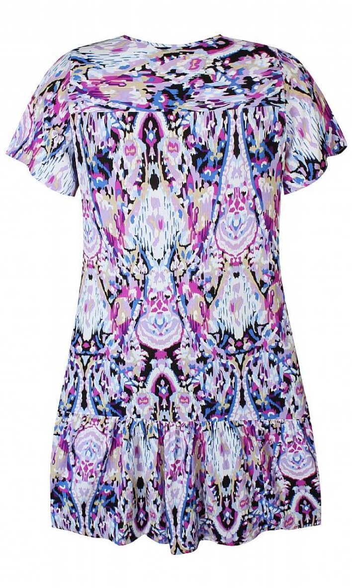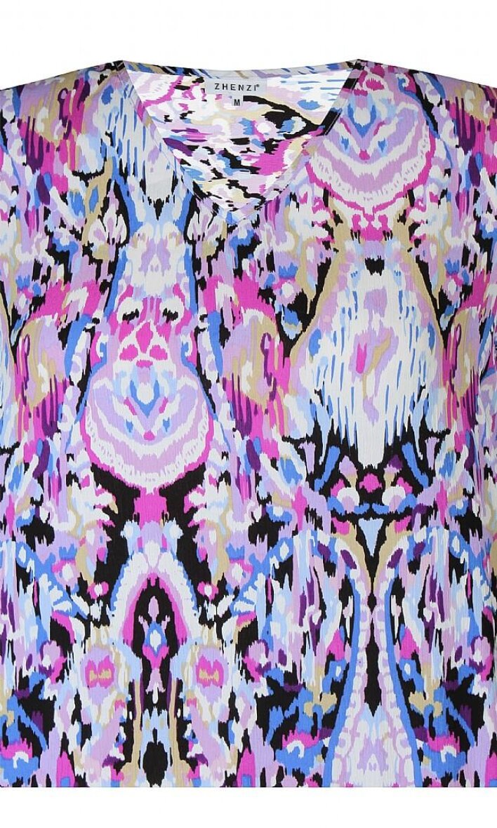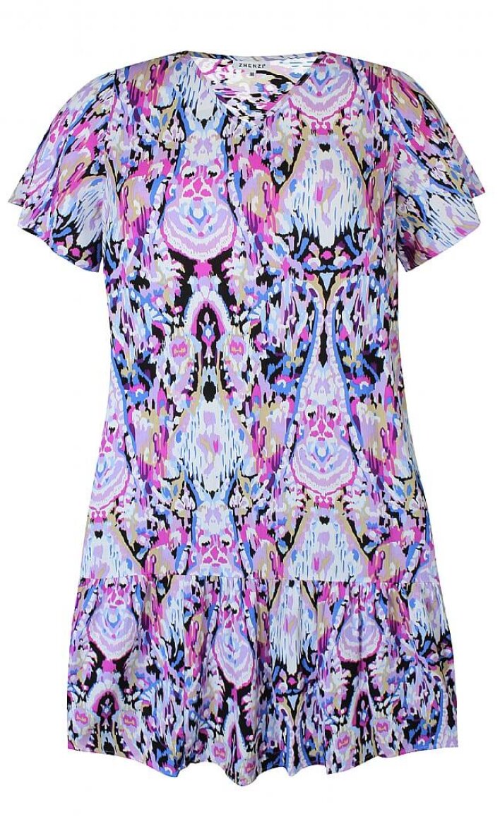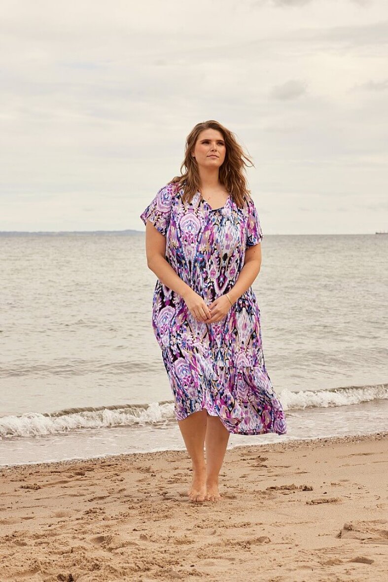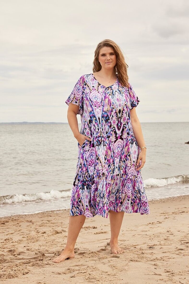 Flot og farverig kjole i et skønt print i lilla nuancer fra Zhenzi. Kjolen er lavet i en lækker 100% crepe viskose kvalitet.