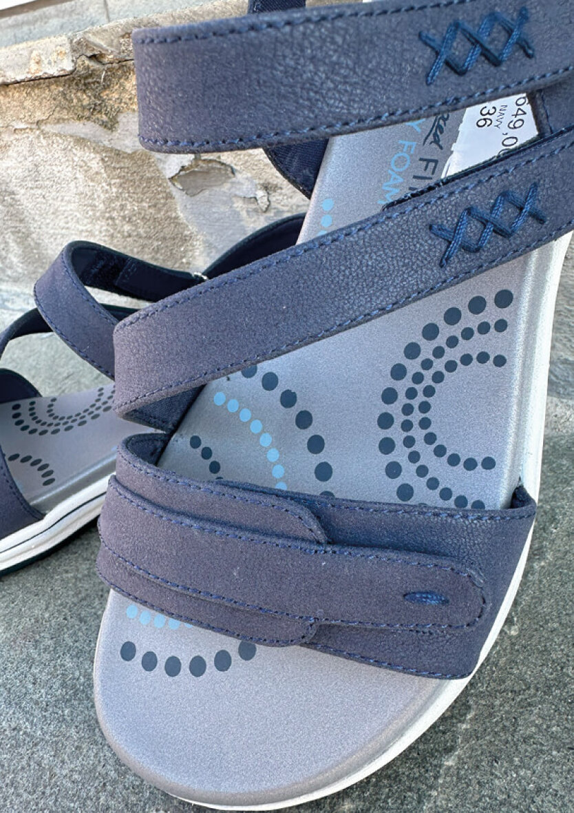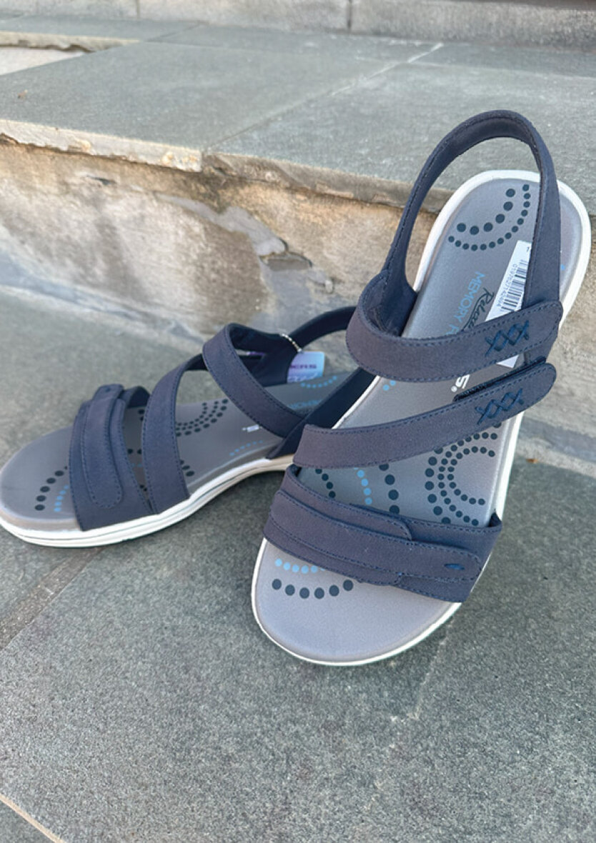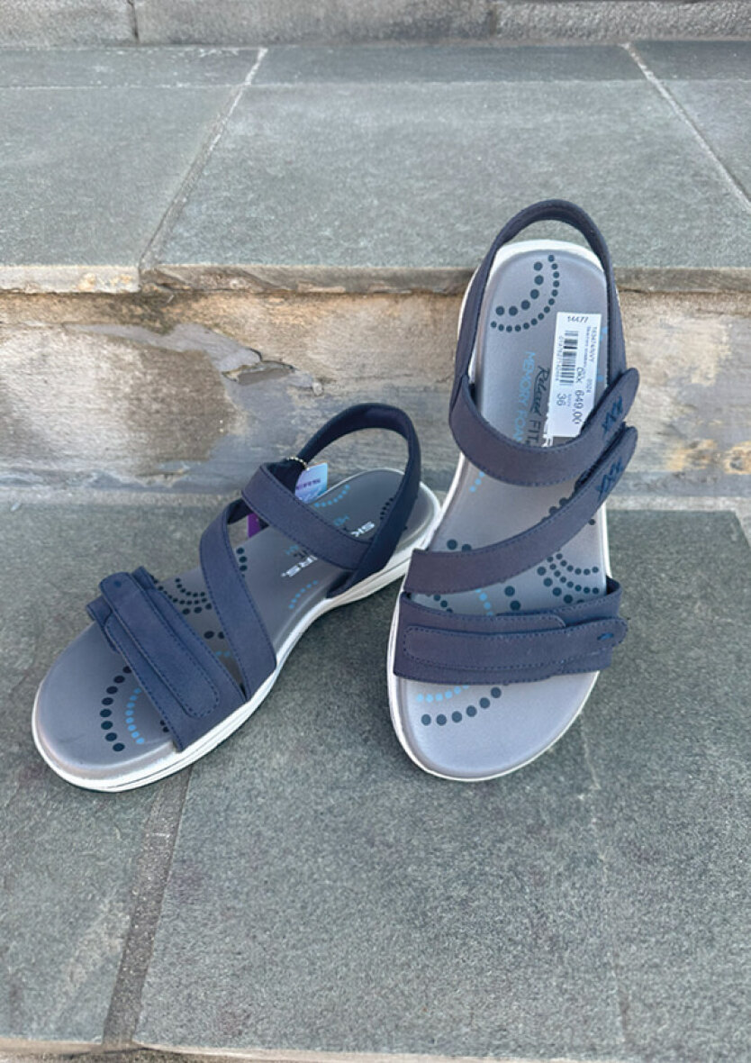 Smart blå sandal fra Skechers. Overdelen er lavet i blå imiteret skind med fine stikningsdetaljer. Sandalen er med en fast ankelrem samt tre velcroremme, så den nemt kan tilpasses foden.