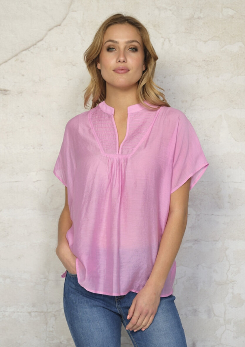 Blusen er med v-halsudskæring med små vandrette læg på fronten, hvilket giver en fin og feminin detalje. Blusen er med korte flagermusærmer.
