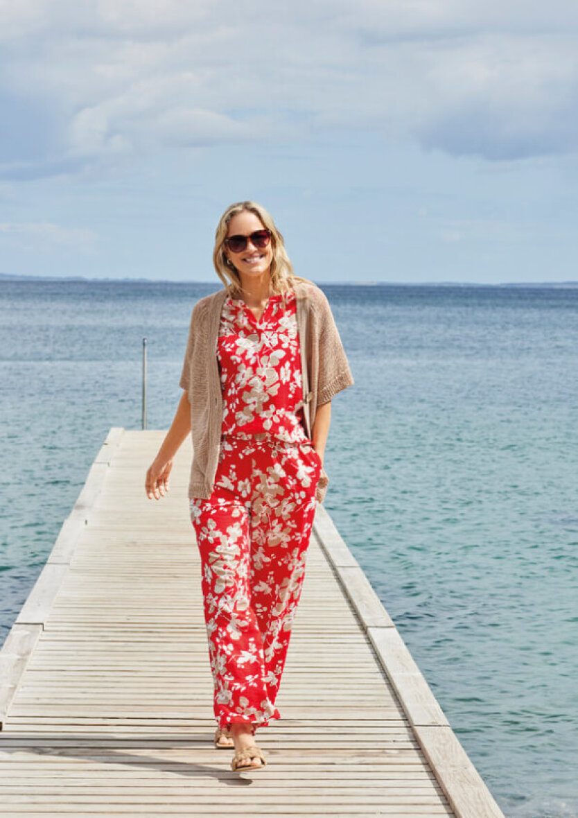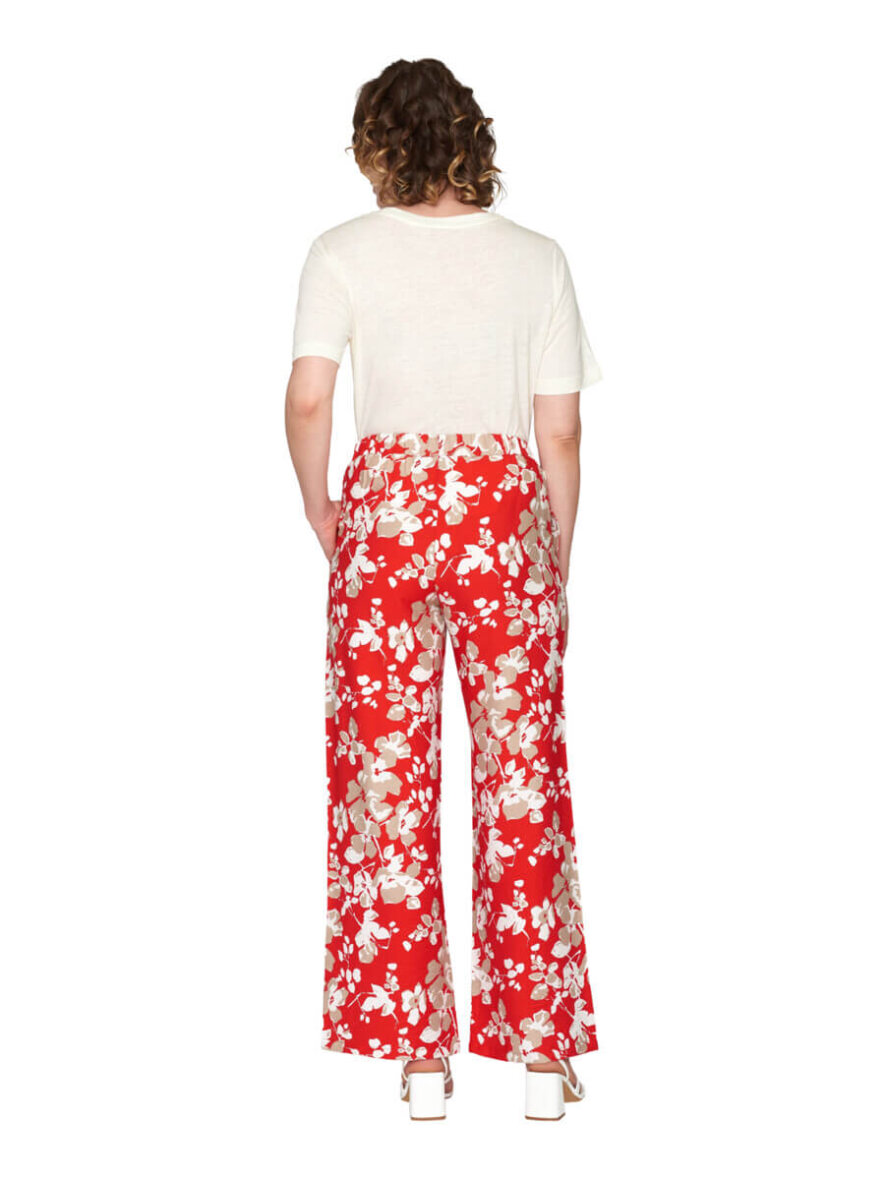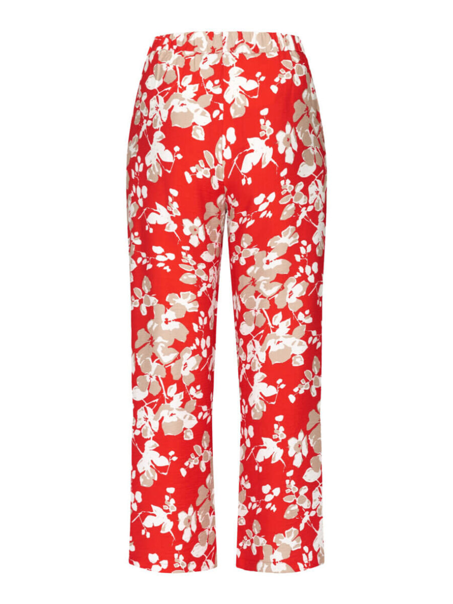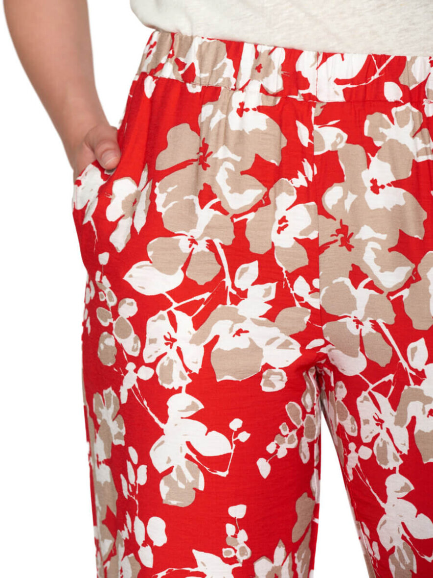 Komfortable røde bukser fra Brandtex. Buksen er lavet i et flot blomstret mønster i hvide og beige farvet toner. Buksen er med elastik i taljen, så den sidder flot til.