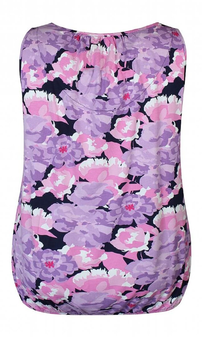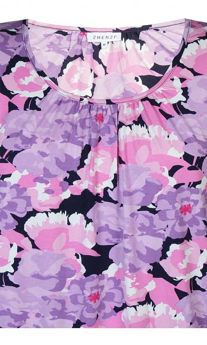 Flot og farverig top fra Zhenzi. Toppens flotte blomsterprint er lavet i en skøn farvekombination af lille og rosa toner.