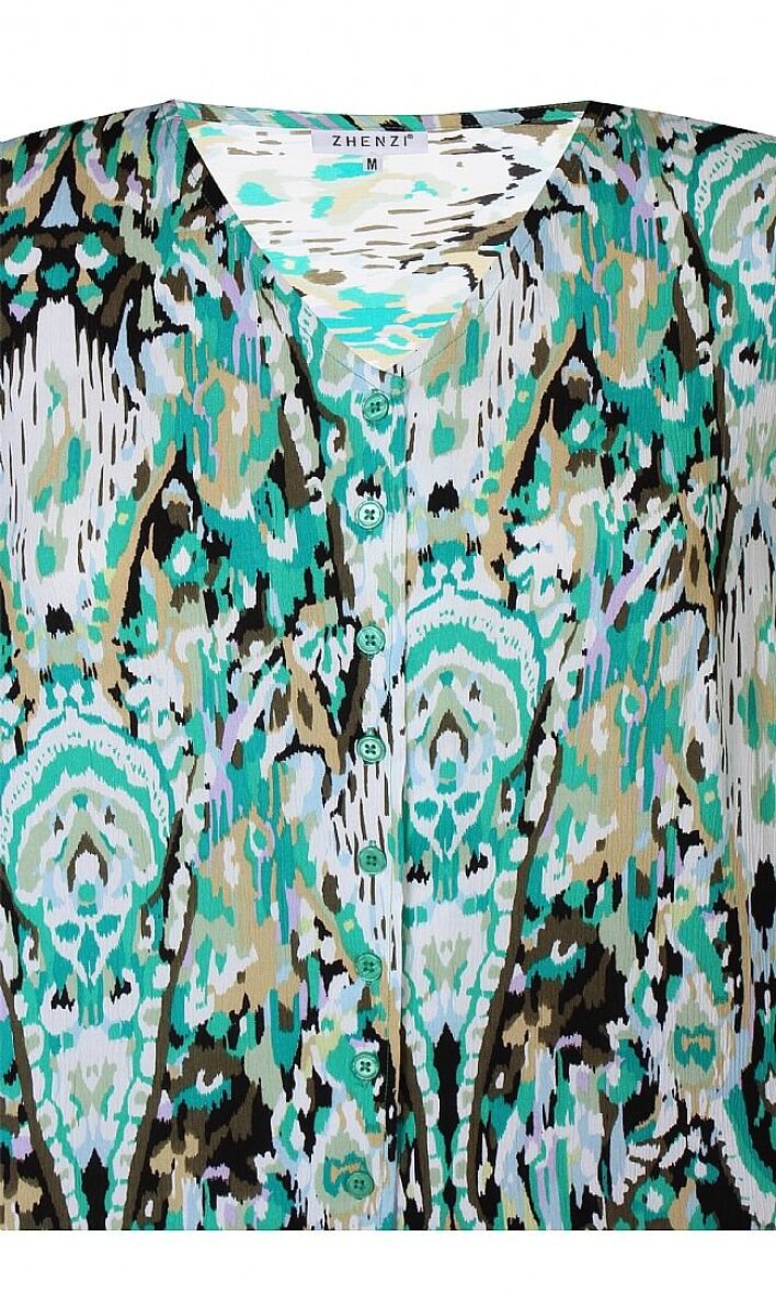 Flot og farverig bluse i et skønt print i grønne toner fra Zhenzi. Blusen er lavet i en lækker 100% crepe viskose kvalitet.