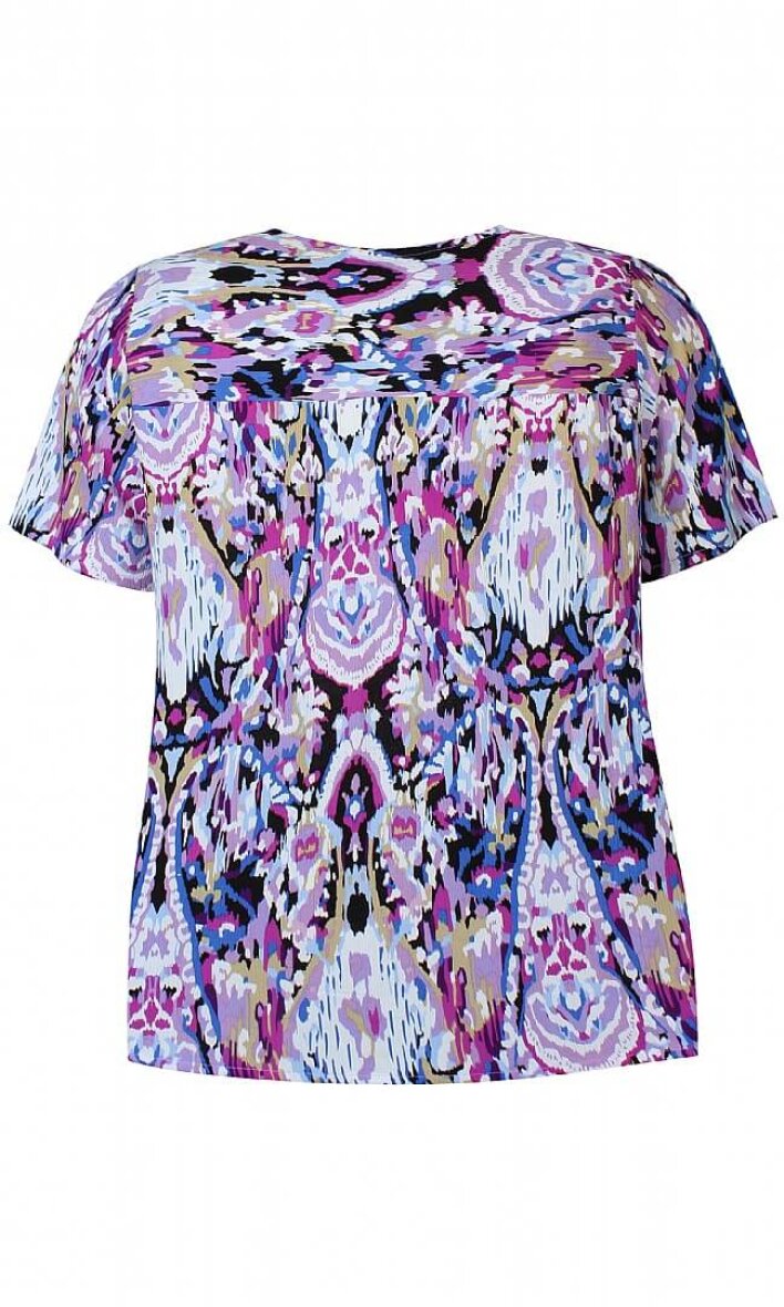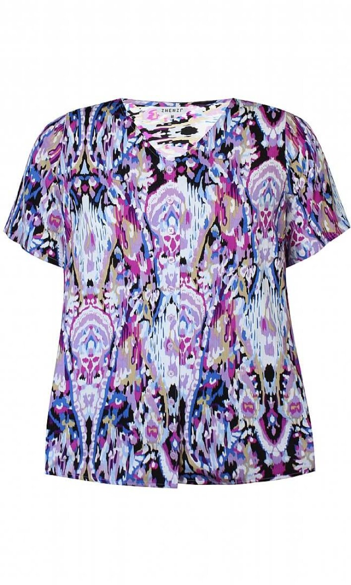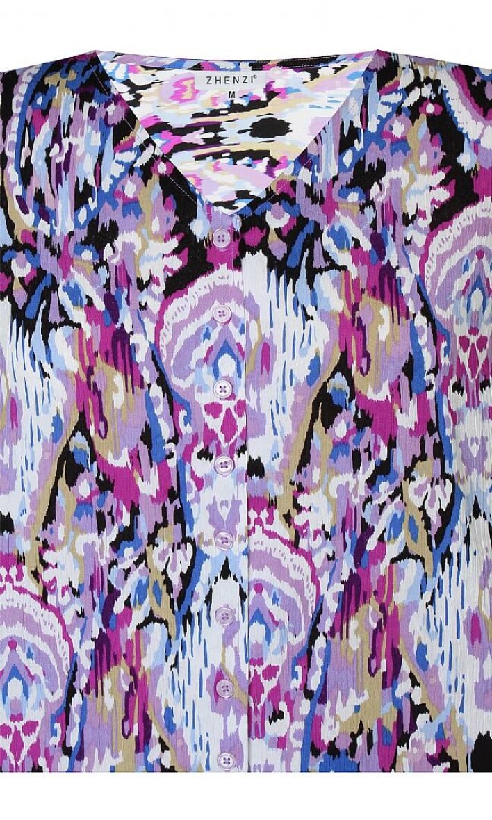Flot og farverig bluse i et skønt print fra Zhenzi. Blusen er lavet i en lækker 100% crepe viskose kvalitet.