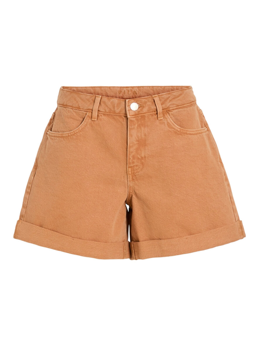 Smarte denim shorts i en flot brun rust farve fra VILA. Shortsene er lavet i et klassisk design med knap og lynlås luk foran. Med bæltestropper og to forlommer samt baglommer.