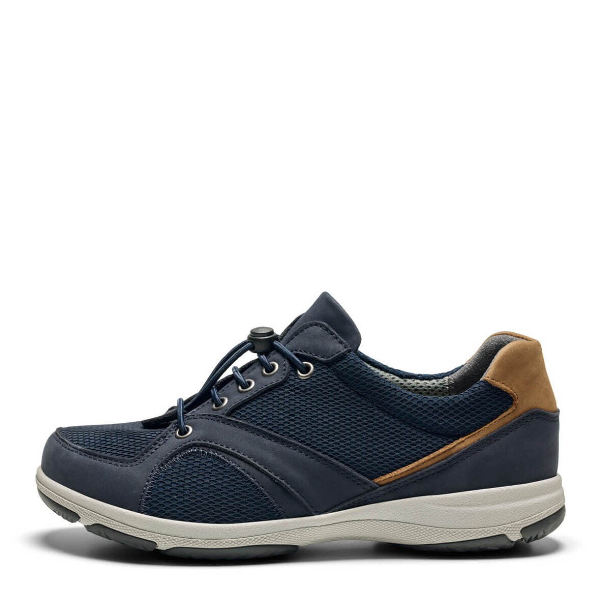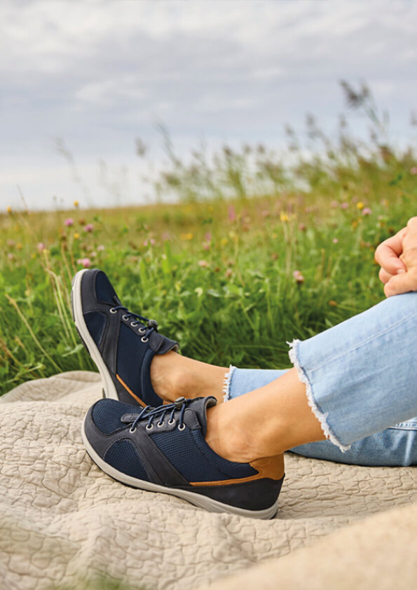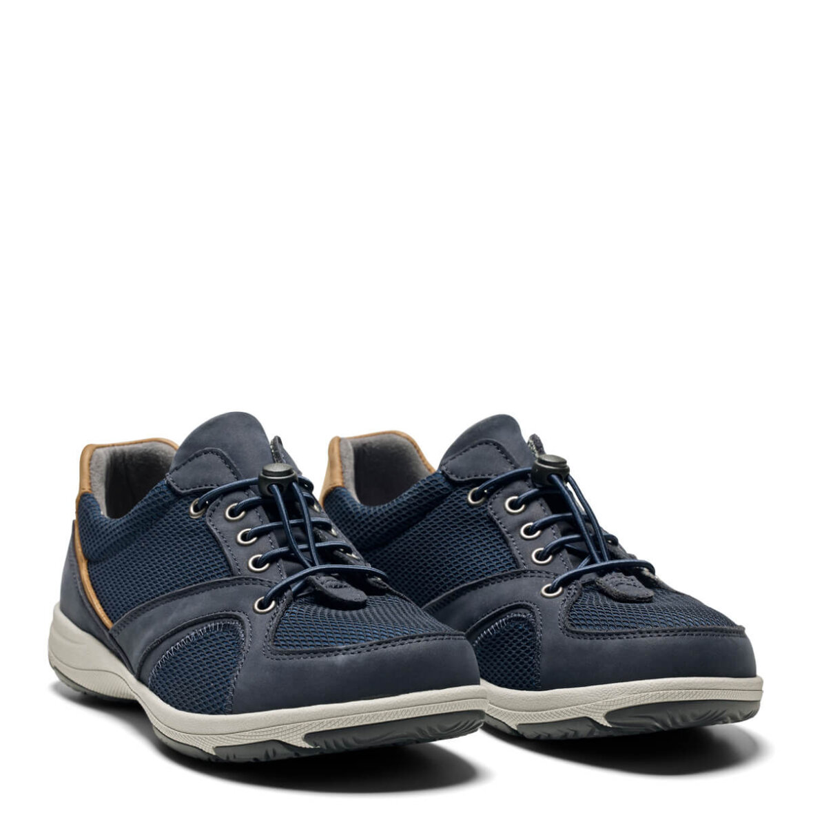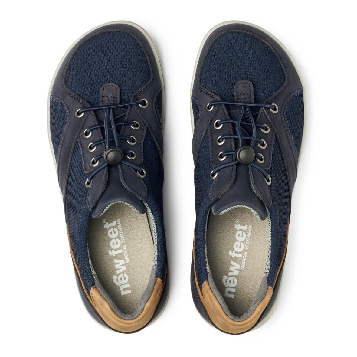 Komfortabel blå sneaker fra New Feet. Skoen er lavet i en kombination af nubuck og mesh tesktil, som giver en god åndbarhed. Skoen er med en flot brun detalje på hælkappe.