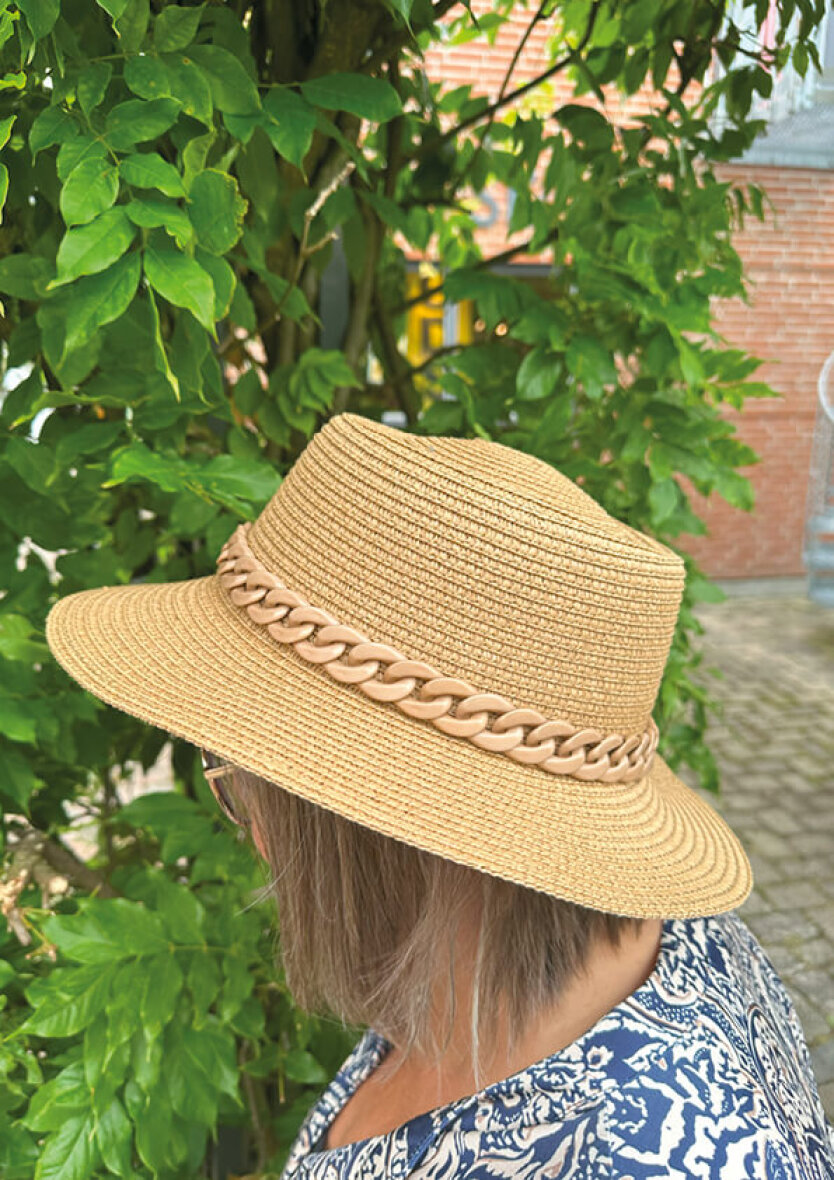 Flot og elegant sommerhat fra Black Colour. Stråhatten er lavet i en flot natur farve i et enkelt design med en fin matchende kæde dekoreret på hatten.