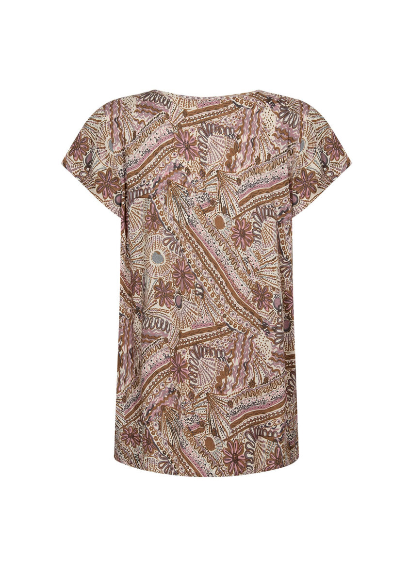 Flot og farverig t-shirt fra Soyaconcept. T-shirten er lavet i et flot multiprint i et fint mix af rosa og brune nuancer.