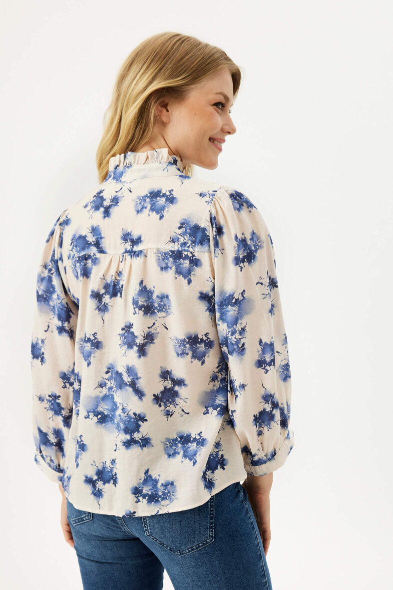 Flot og feminin hvid skjorte med det fineste blå blomstret mønster fra In Front.
