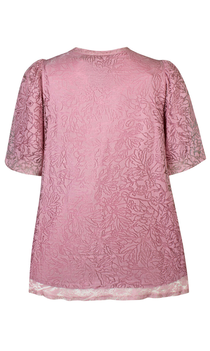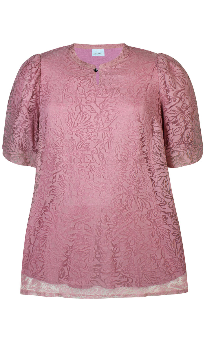 Smuk og elegant rosa tunika fra Zhenzi i et flot transparent blomster print. Tunikaen er lavet i en flot A-form som klæder de fleste kropstyper. Tunikaen er med rund hals og nøglehuls detalje med en fin knap. Tunikaen har 3/4 lange pufærmer med en indvendig elastikkant.