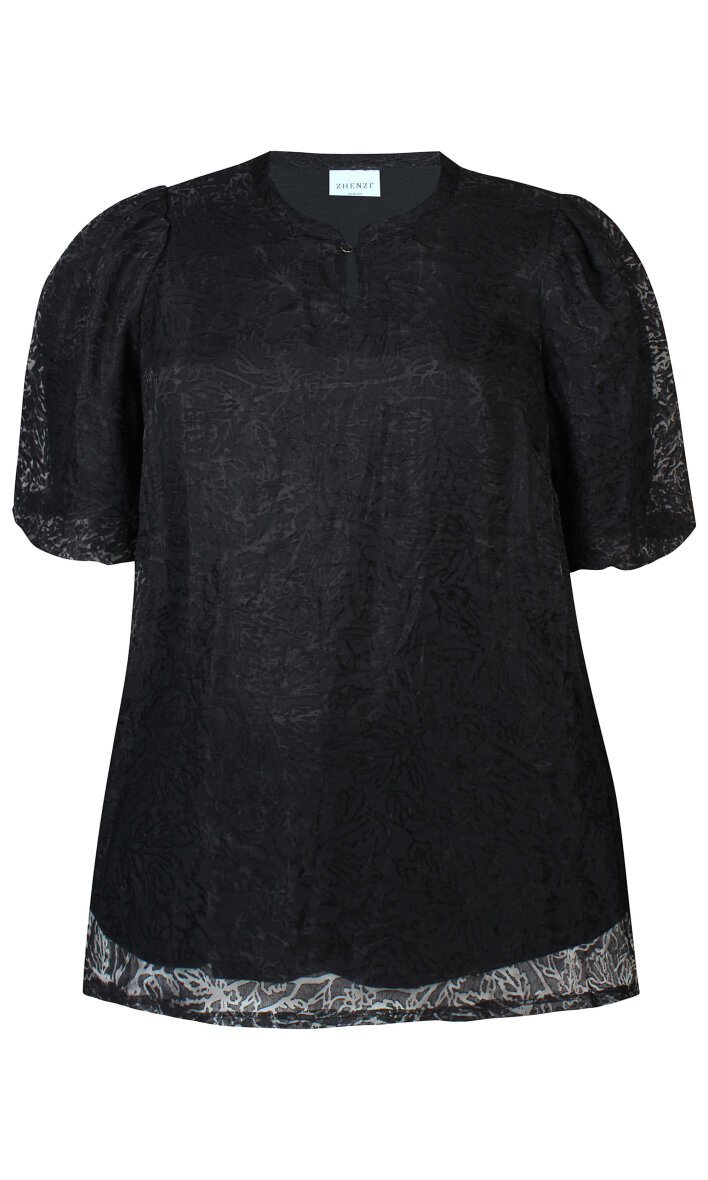 Smuk og elegant sort tunika fra Zhenzi i et flot transparent blomster print. Tunikaen er lavet i en flot A-form som klæder de fleste kropstyper. Tunikaen er med rund hals og nøglehuls detalje med en fin knap. Tunikaen har 3/4 lange pufærmer med en indvendig elastikkant.