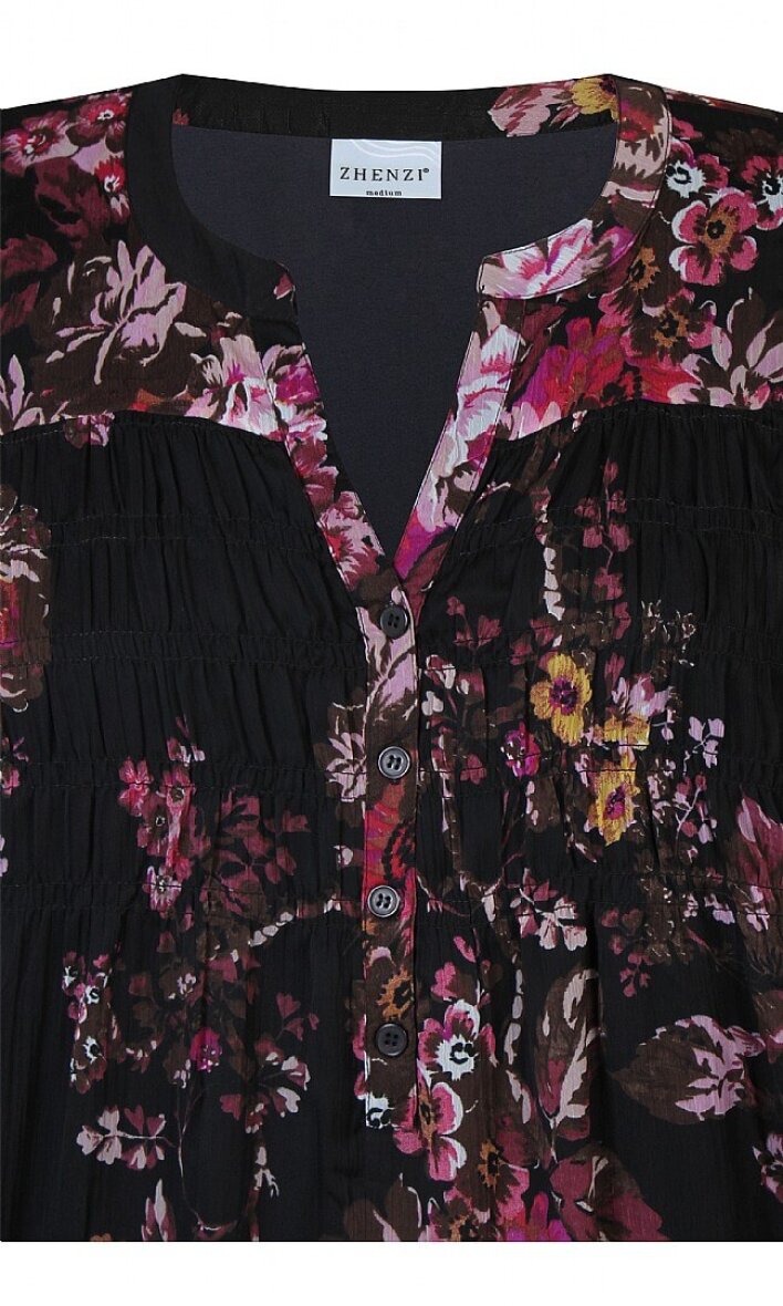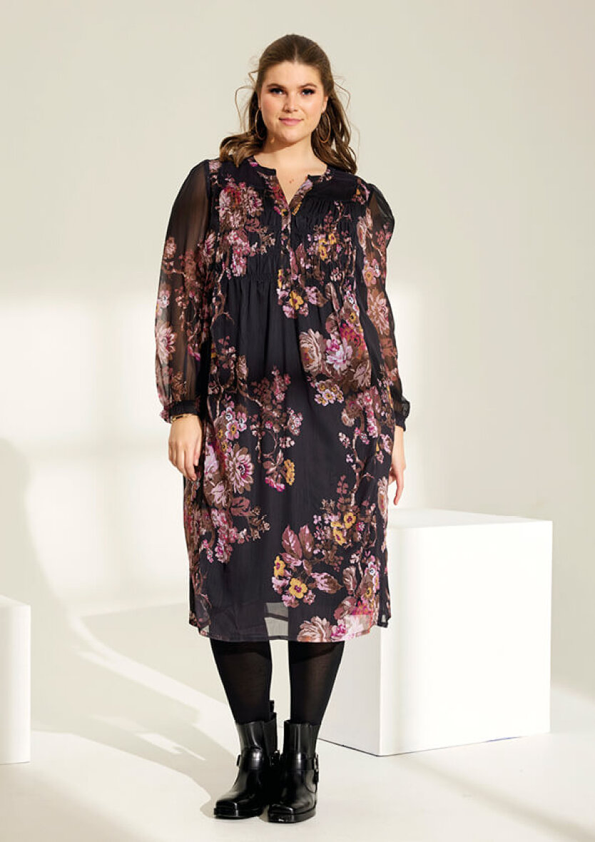 Flot sort halvlang kjole i et skønt blomsterprint fra Zhenzi. Det skønne blomsterprint er designet i smukke rosa toner.