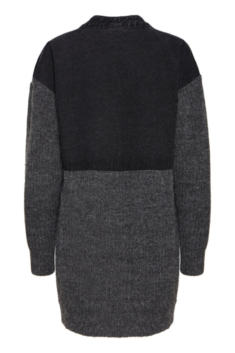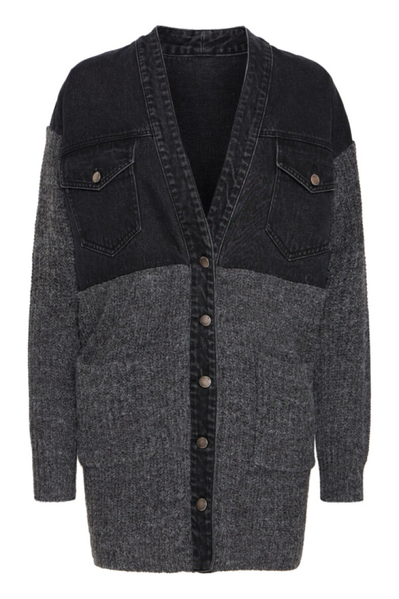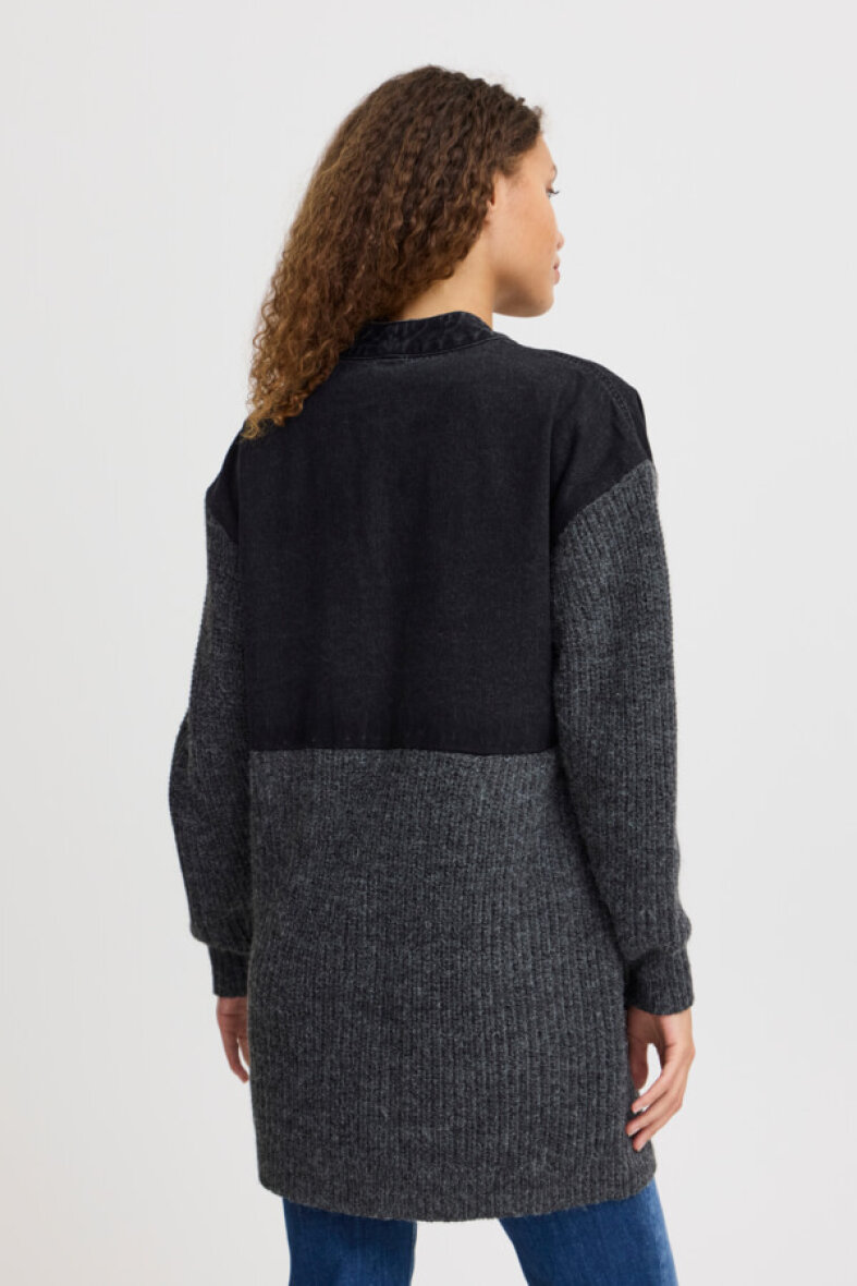 Smart og anderlede jakke fra Pulz Jeans i et mix af denim og strik. Jakken har et langt cardigan look med v-hals og gennemgående knapper langs fronten.