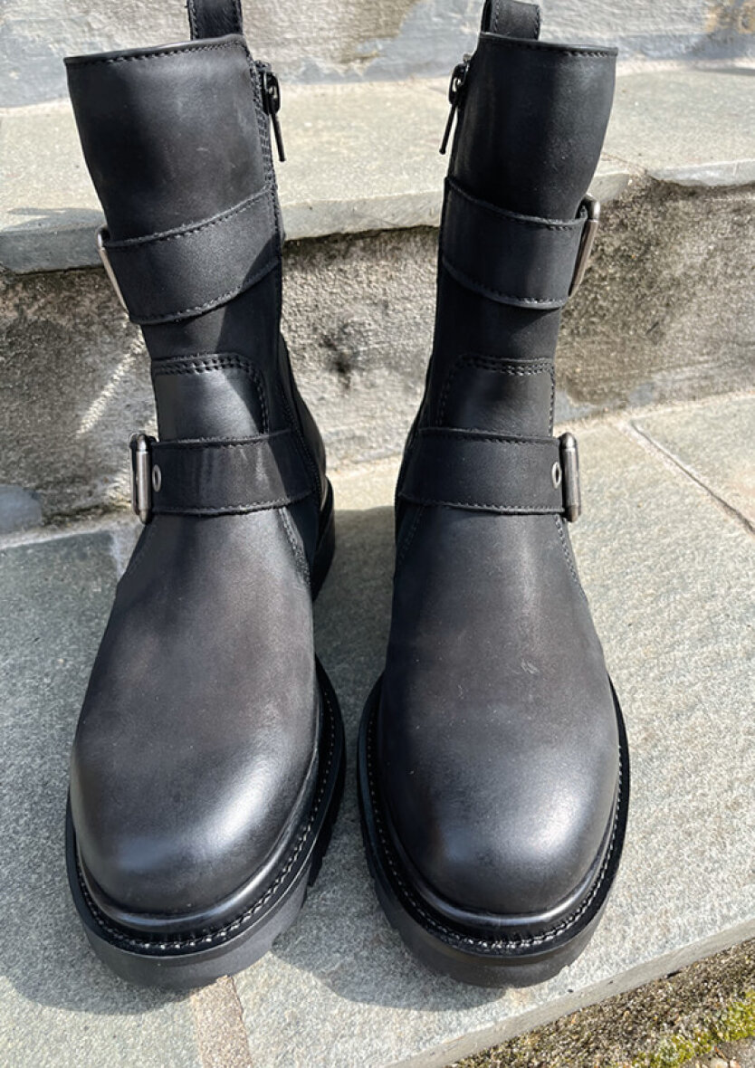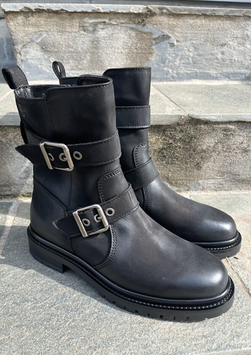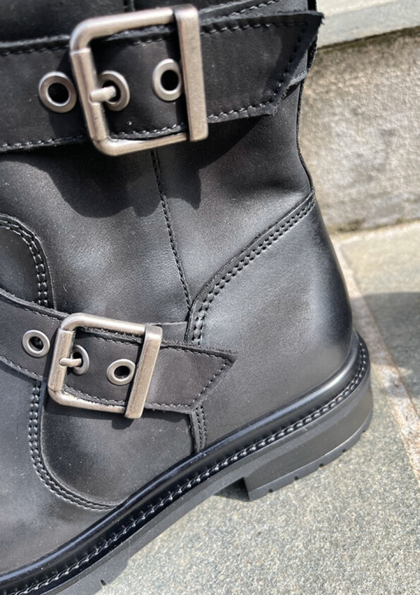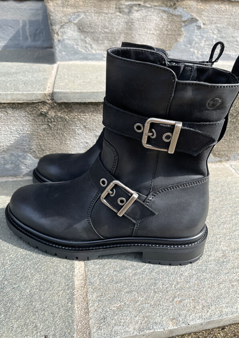 Flot klassisk sort støvle i kvalitets skind fra Tamaris. En smart ankelstøvle med moderne spænder, som tilføjer et fedt råt look. Støvlerne er med lynlås, som gør dem nemme at komme af og i.