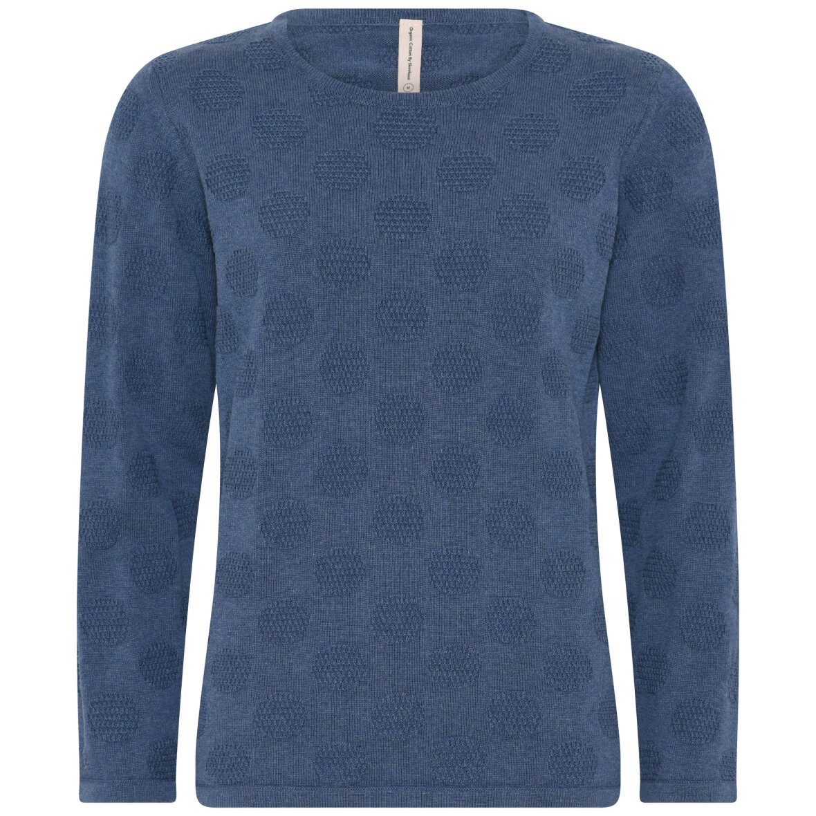 Flot striktrøje i en flot blå farve fra Skovhuus. Striktrøjen er lavet i et flot og enkelt design med cirkler med struktur i vævningen.