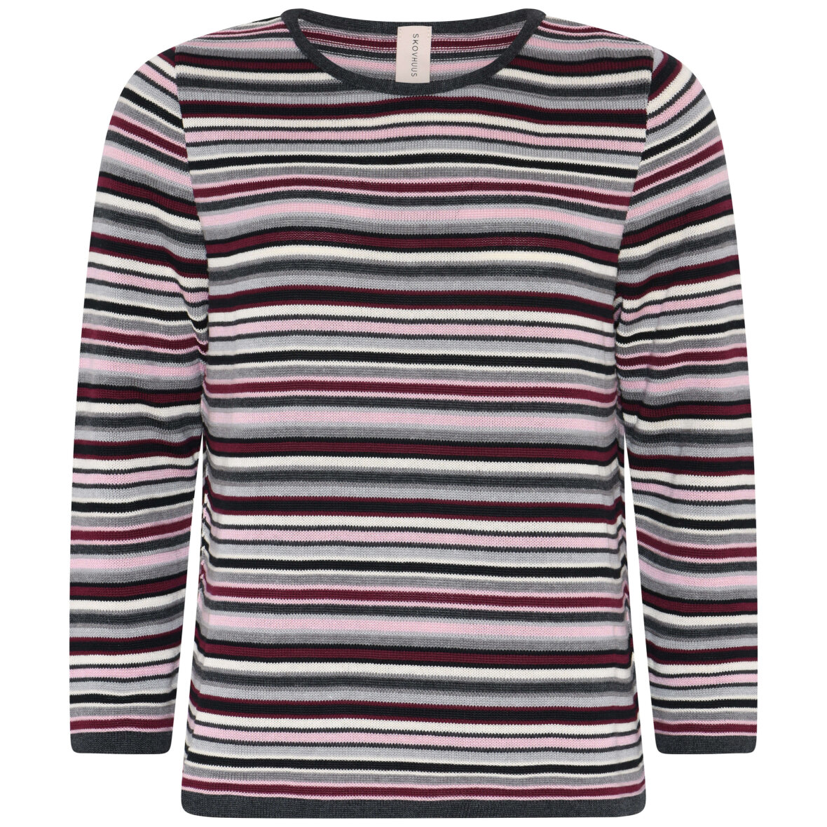 Flot og farverig striktrøje fra Skovhuus. Striktrøjen er vævet i et flot stribet mønster i lyserøde og grå nuancer.