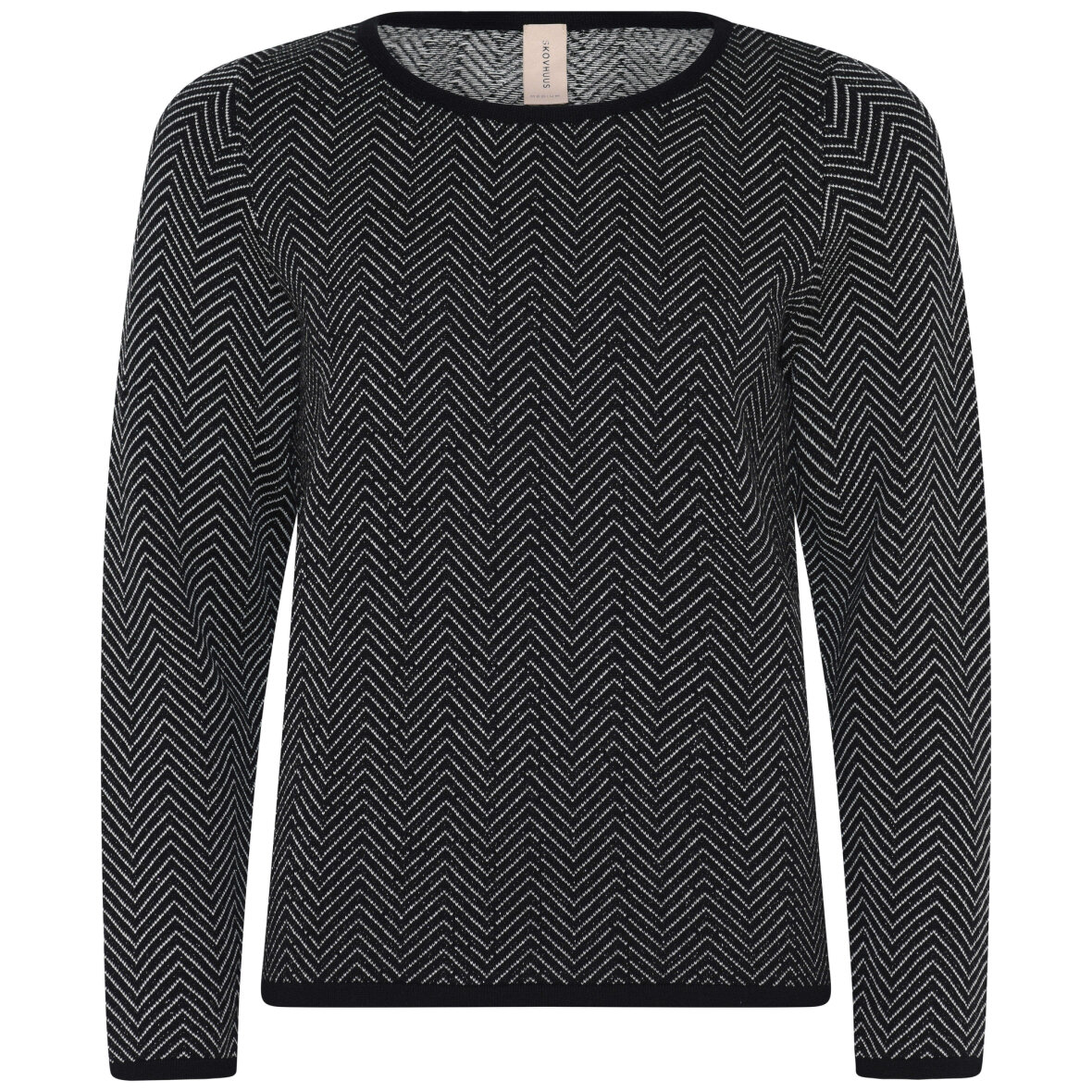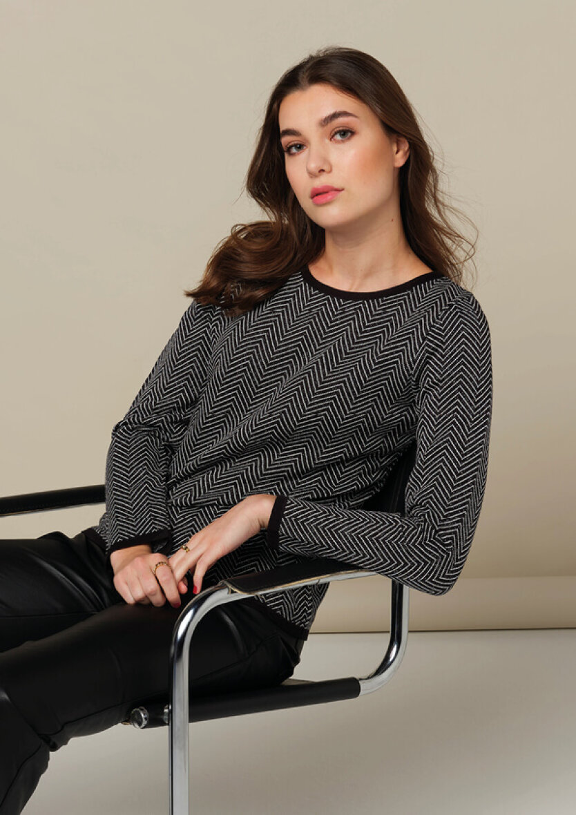 Flot og enkel sort striktrøje fra Skovhuus. Striktrøjen er vævet i et flot hvidt zigzag mønster. Den lette strik er vævet med en fin glimmertråd, som giver en fin detalje til trøjen.