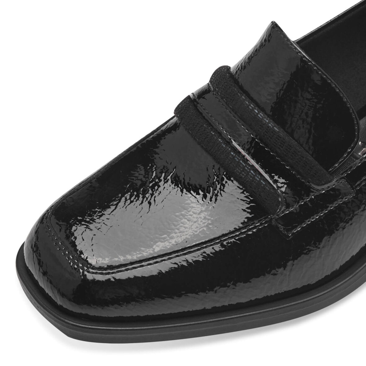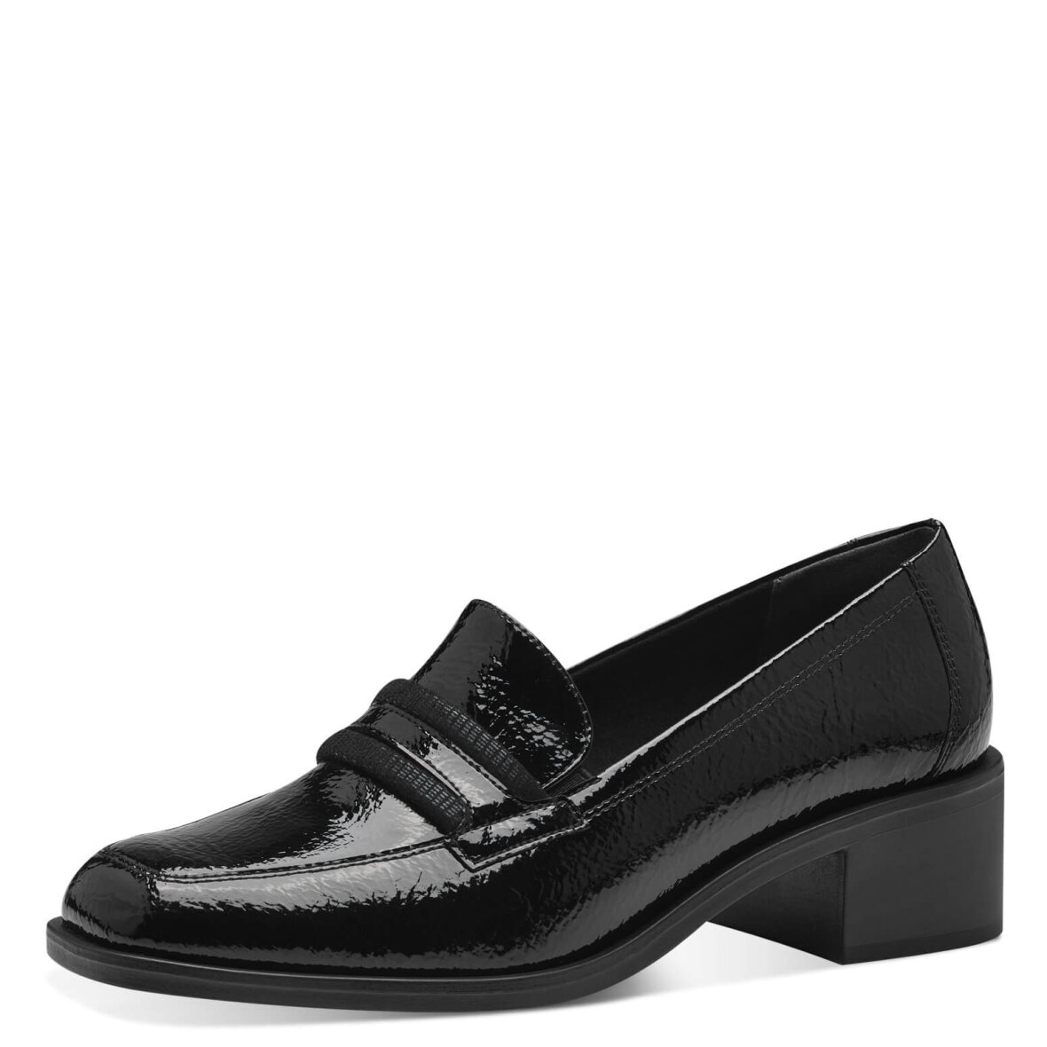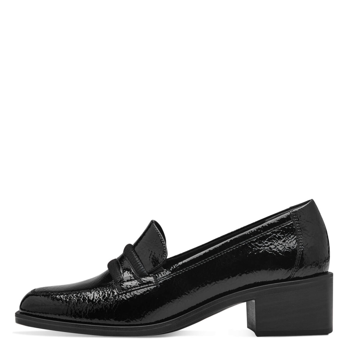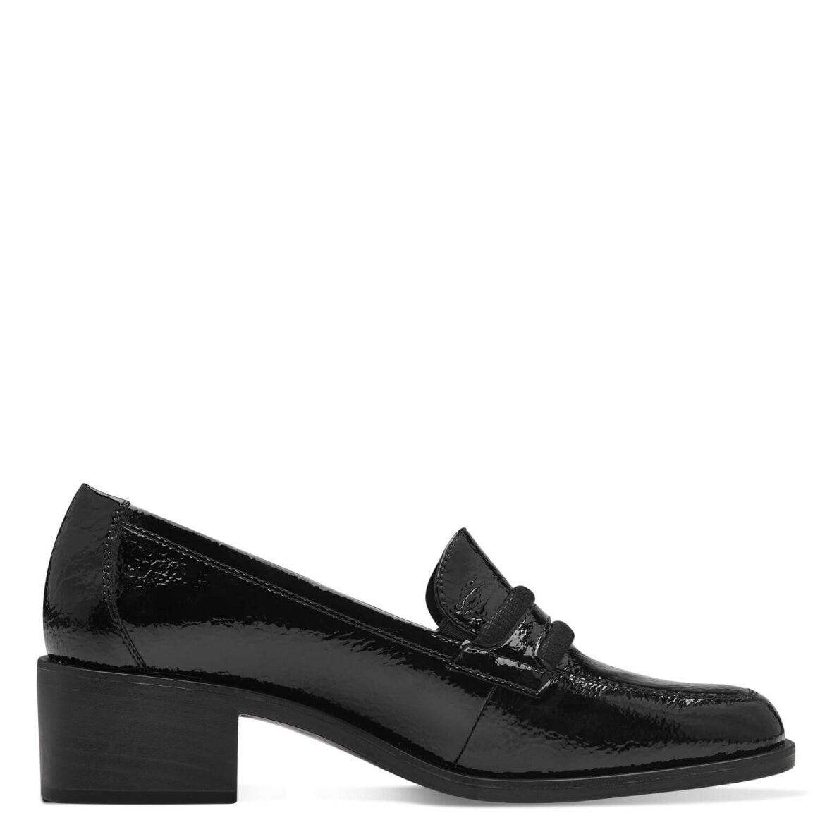 Flot og elegant sko fra Tamaris. Skoen kommer i et klassik sort og shiny design med bånd over vristen. Skoen er med blokhæl på 4 cm samt en let firkantet snude.