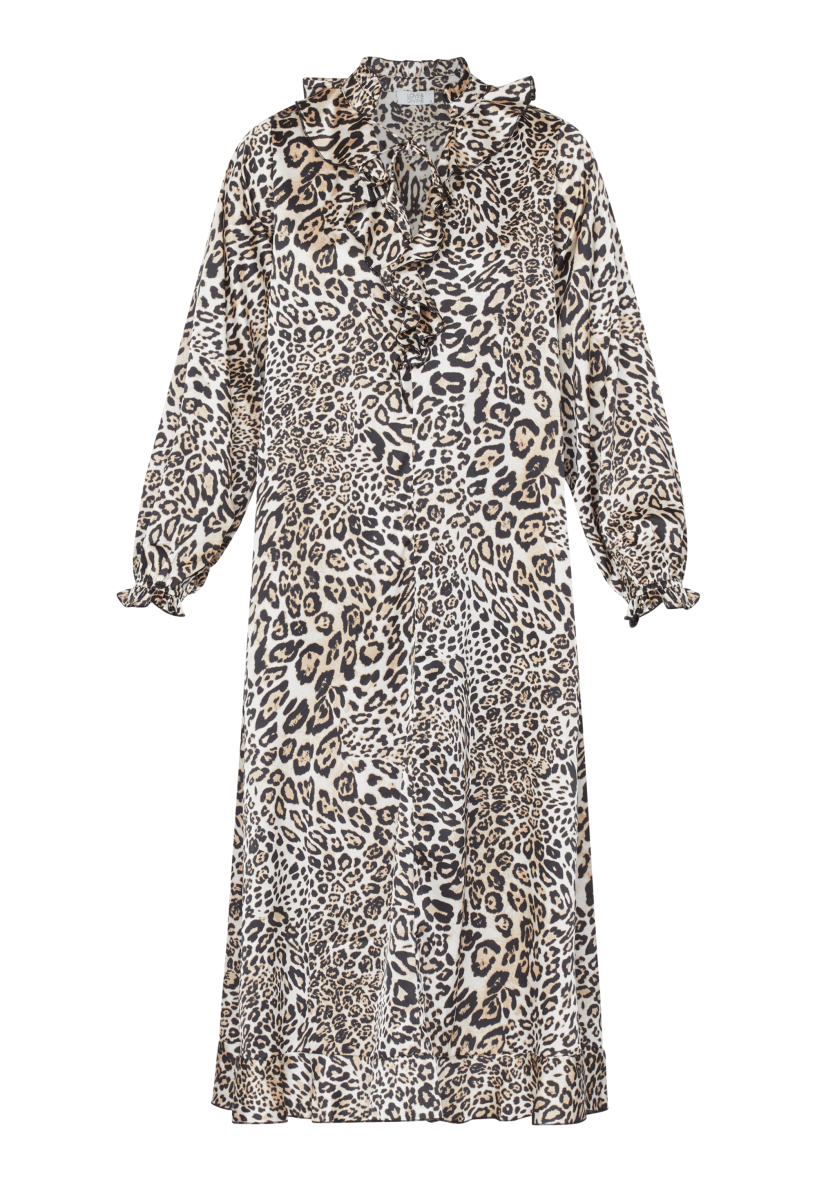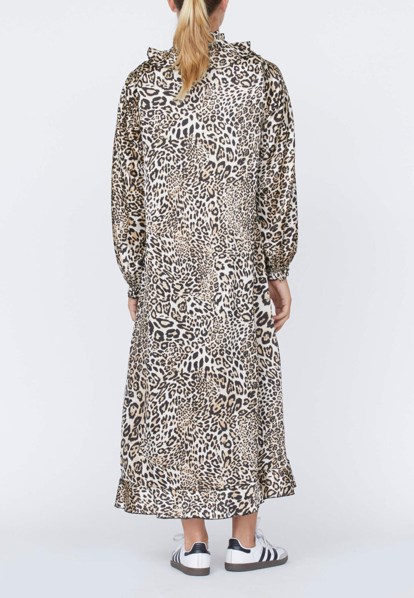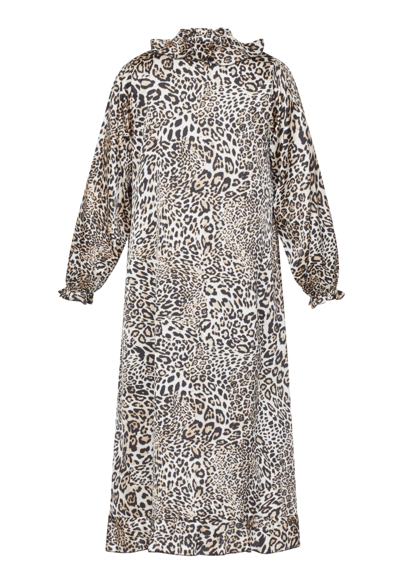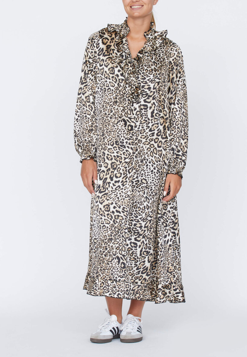 Kjolen har en løs og rummelig pasform, som stadig er flatterende. En smuk kjole i det moderne leopard print, som passer til enhver festlig anledning.