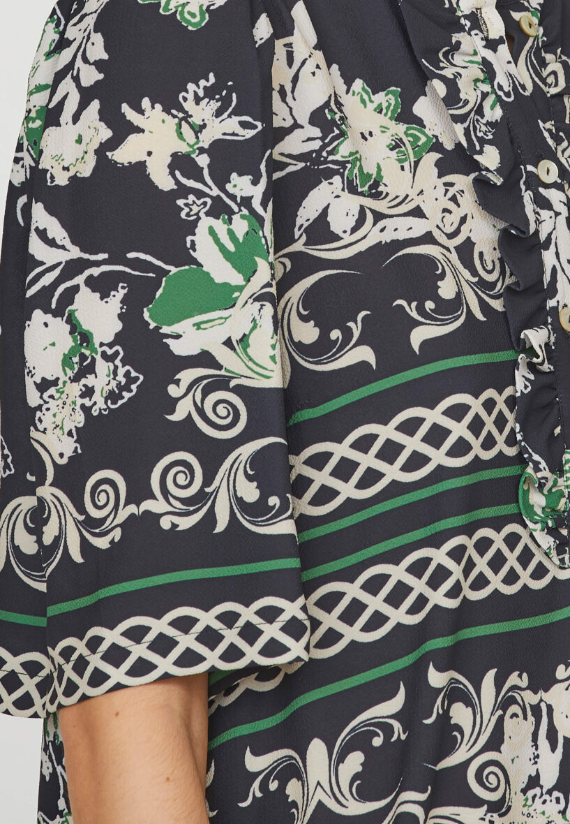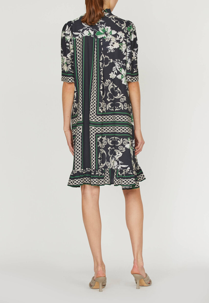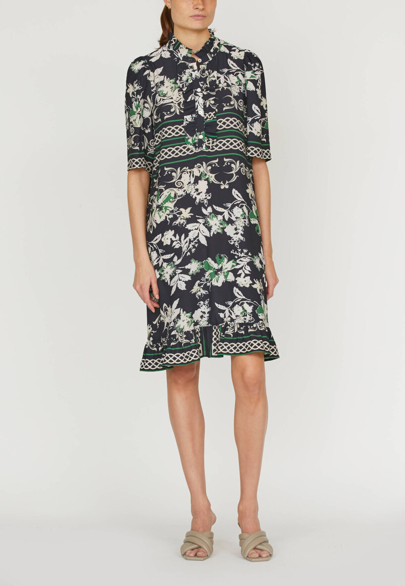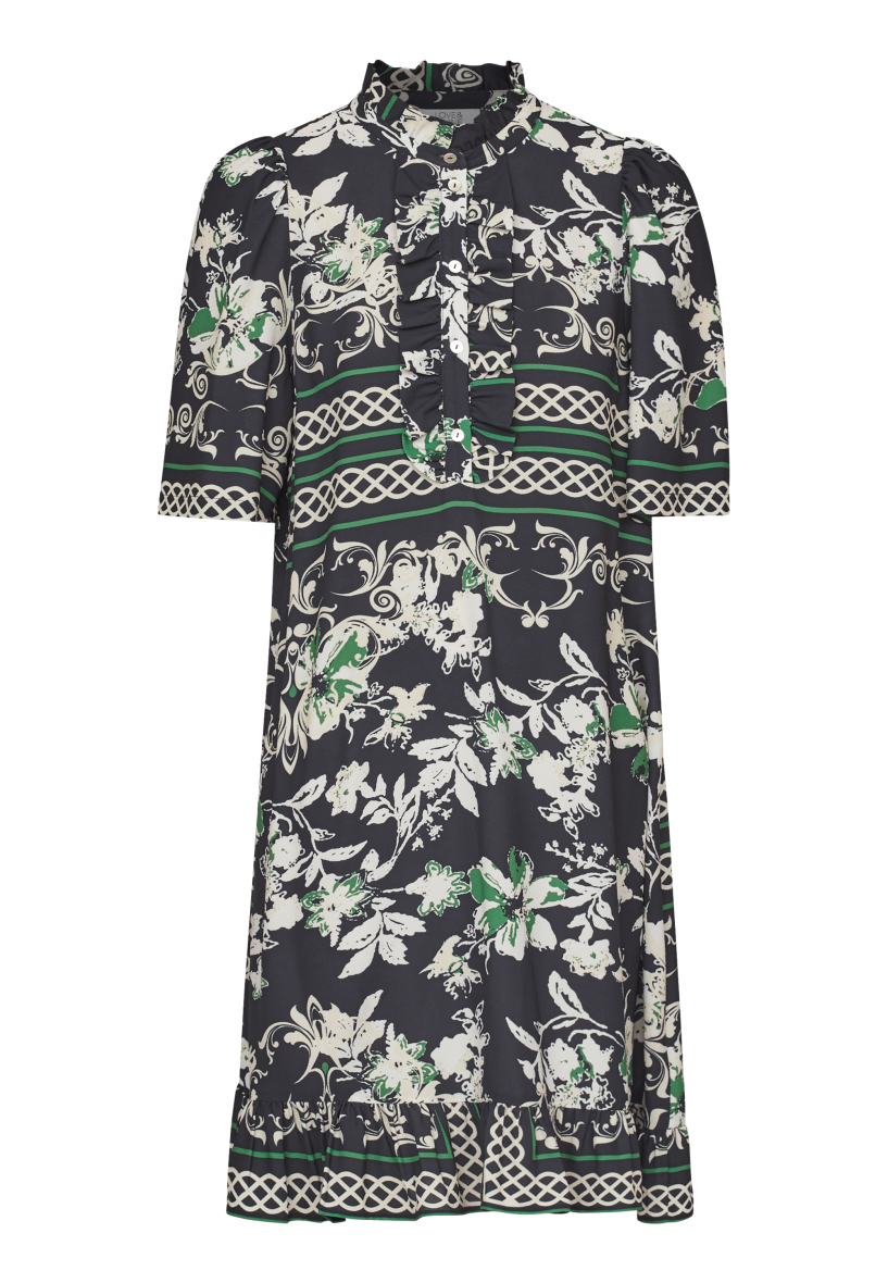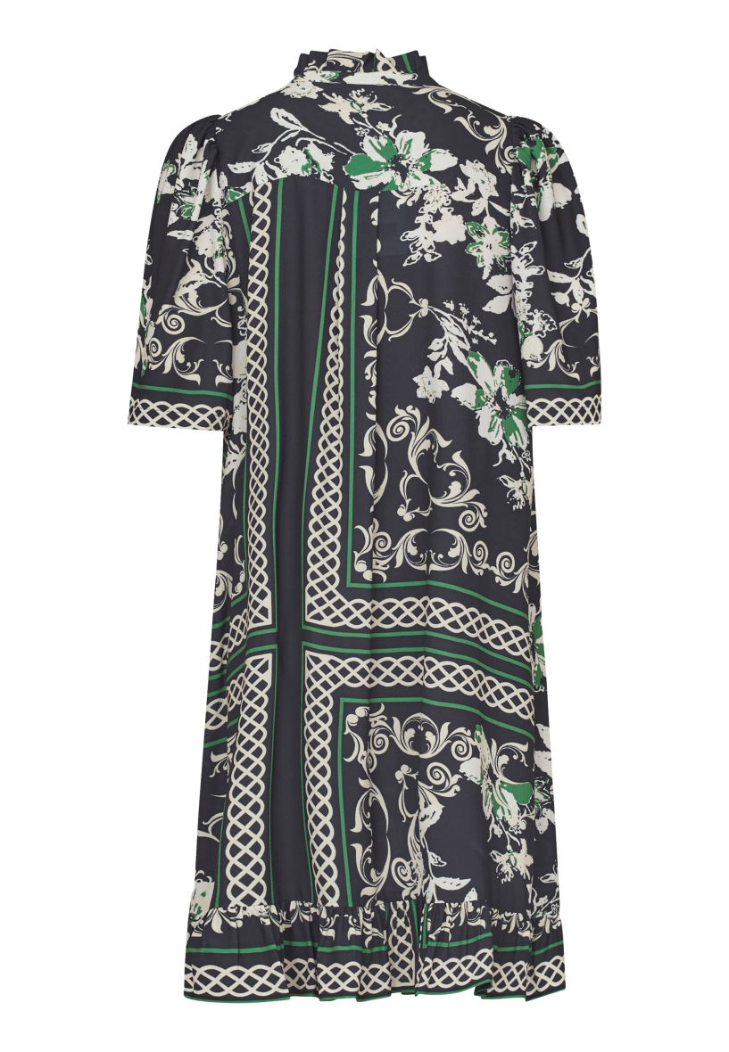 Fin knælang kjole fra Love & Divine. Den sorte kjole er lavet i et flot og moderne print i hvid og grøn. Kjolen er med korte brede ærmer, med en anelse puf ved skulderen.