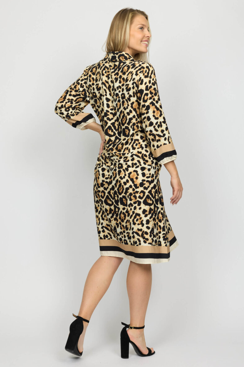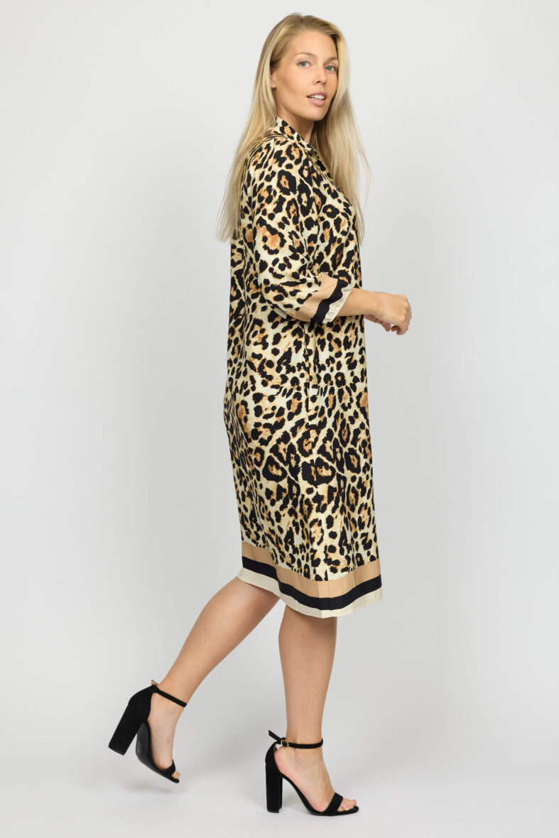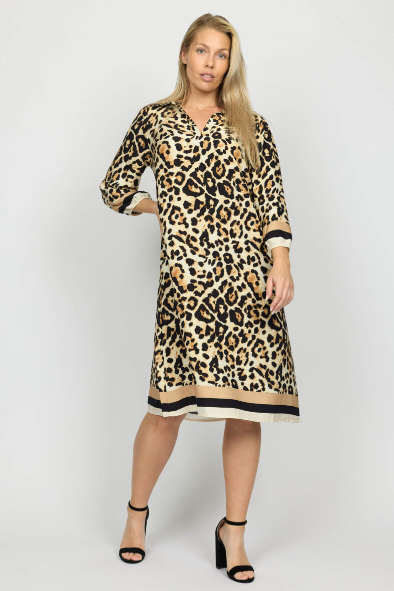 Smuk halv lang kjole i det fineste leopard print fra 2-Biz. Solvej kjolen er lavet i en lækker polyester kvalitet.