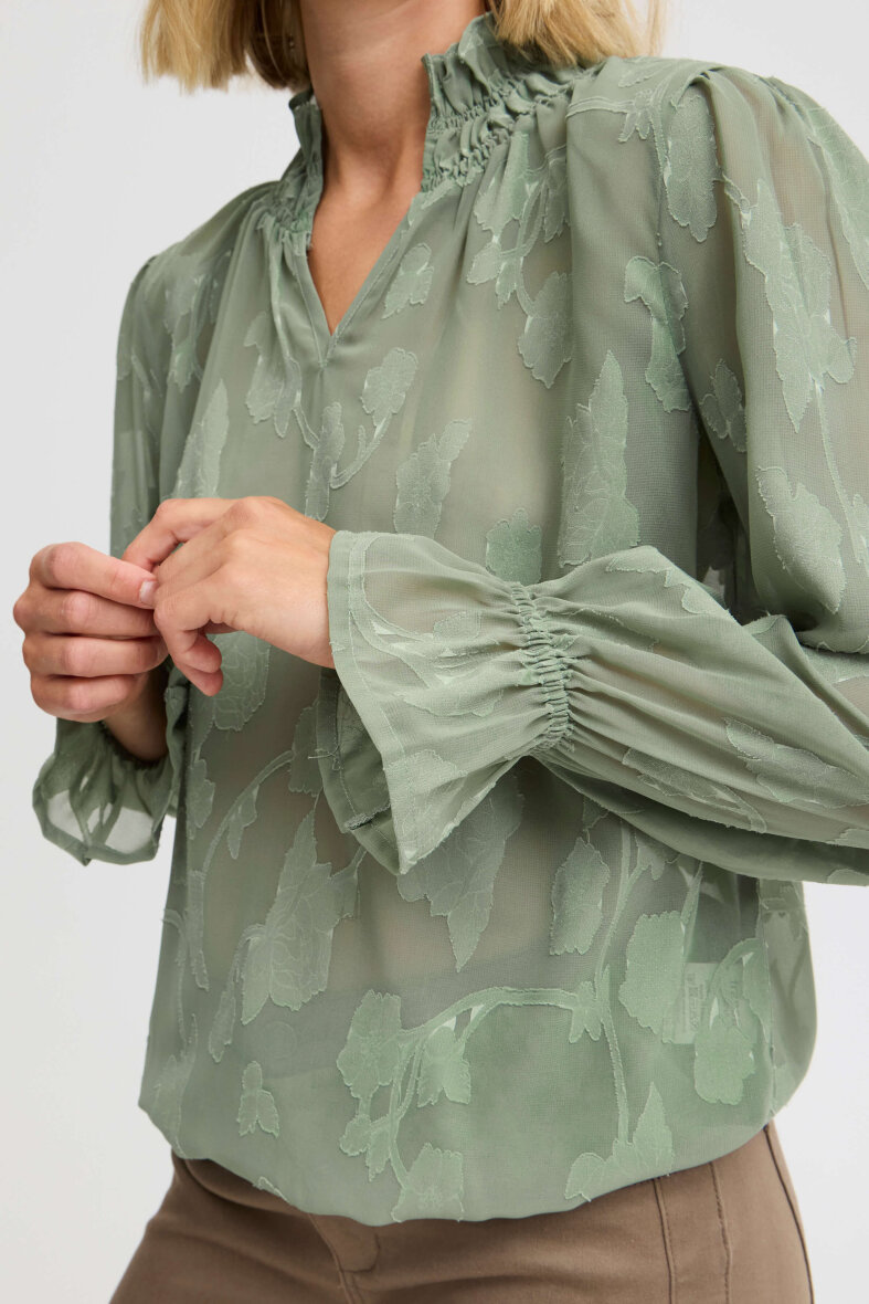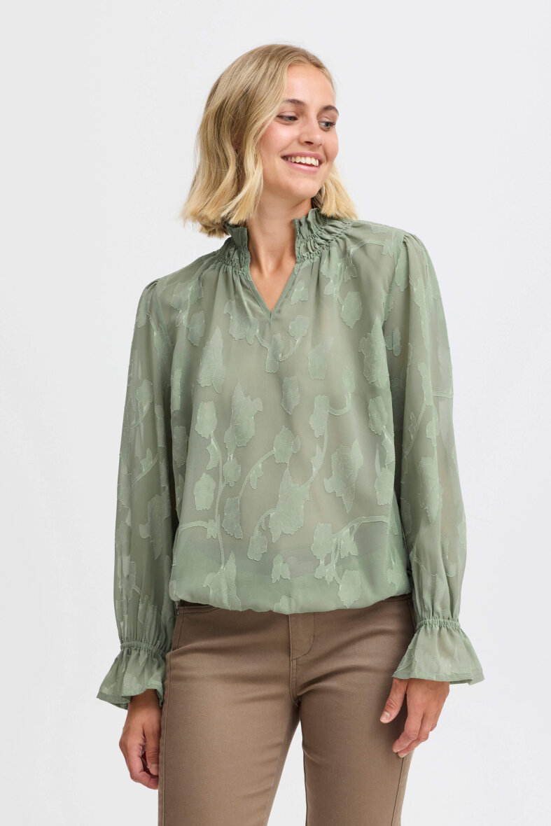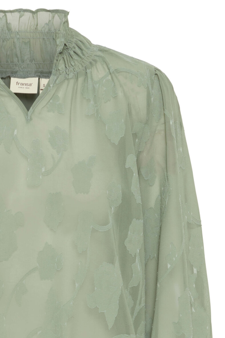 Smuk bluse fra FRANSA med fine detaljer. Blusen er lavet i et skønt grøn design med blomsterprint med struktur.