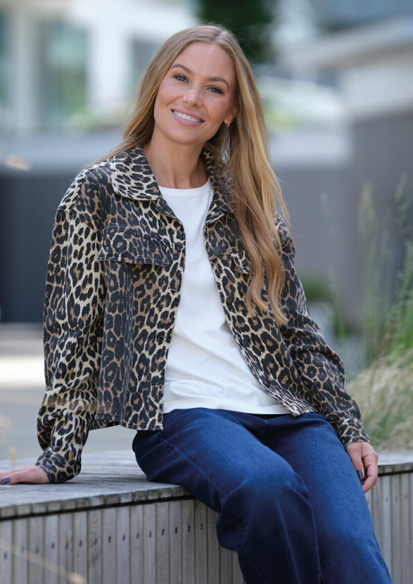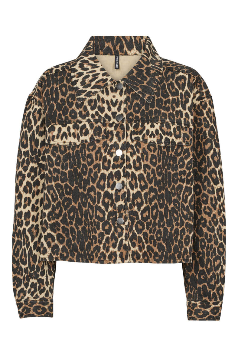 Flot kort denim jakke fra Prepair i modellen Milau. Jakken er lavet i et flot moderne leopard print. Jakken er lavet i en kort og løs pasform.