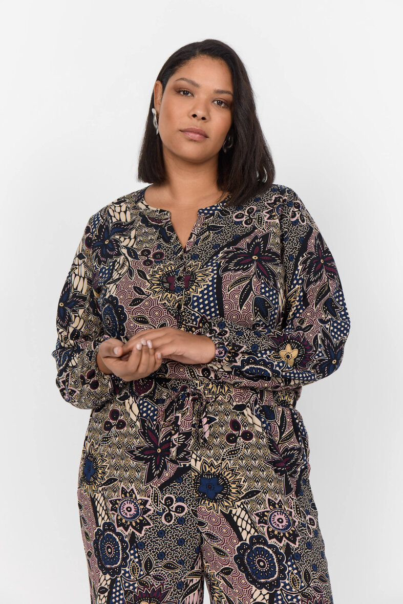 Flot bluse fra Wasabiconcept i modellen WA-JADE 1. Blusen er designet i et fint blomsterprint i hvid, sort, rosa og blå.