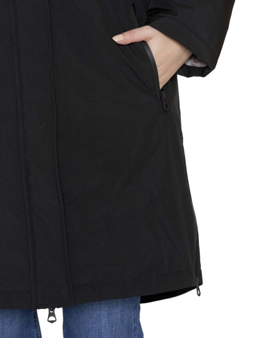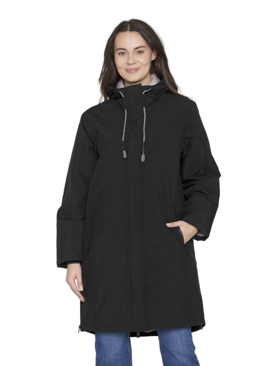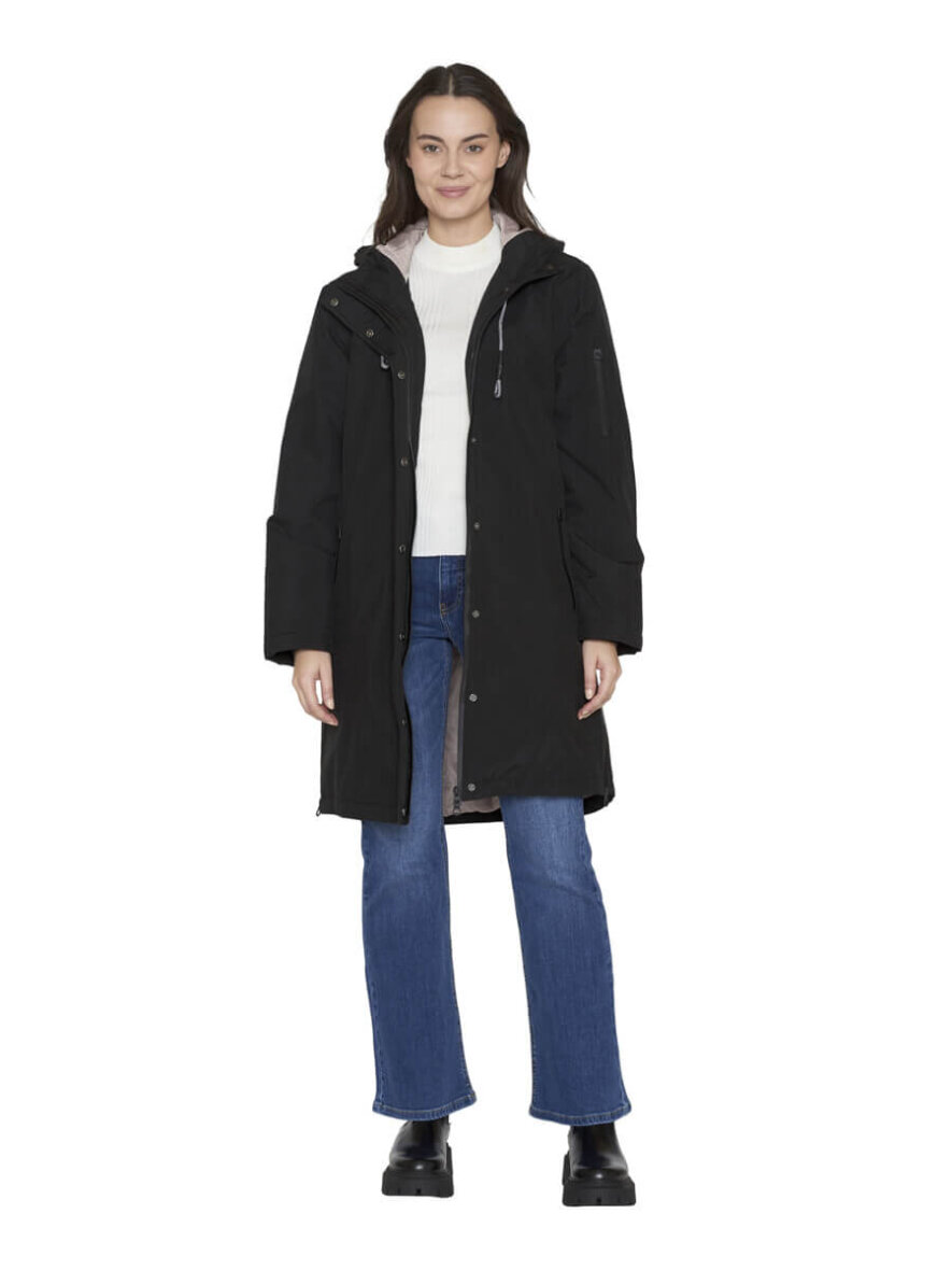Smart knælang jakke fra Brandtex. Jakken er lavet i et klassisk sort design. Jakken er lavet i en 100% polyester kvalitet.