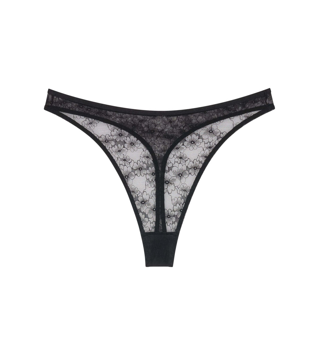 Højtaljet string fra Triumph i et elegant sort blonde design. Denne string er lavet i et gennemsigtigt design med glatte detaljer og kanter, som gør den perfekt under tætsiddende tøj.