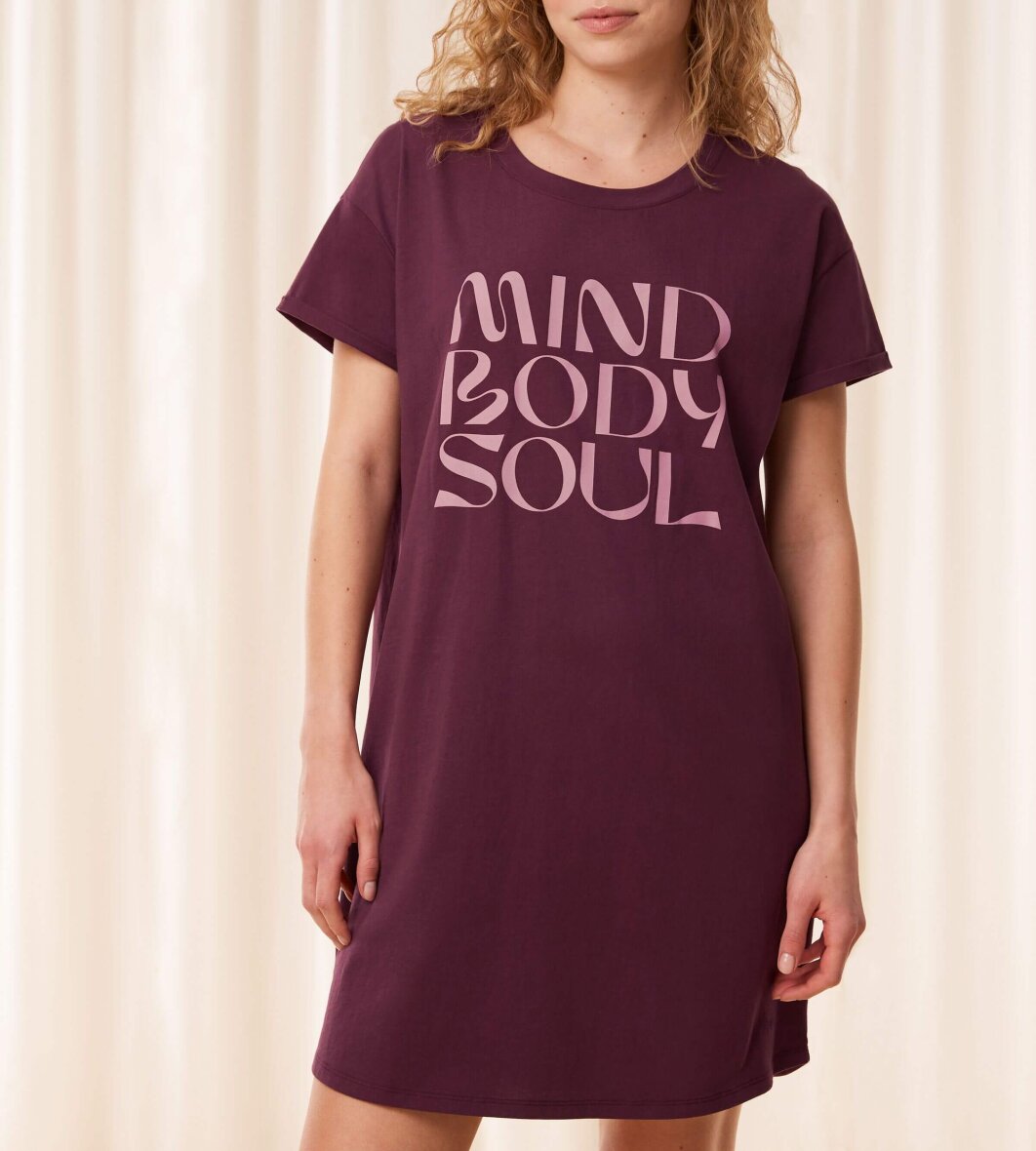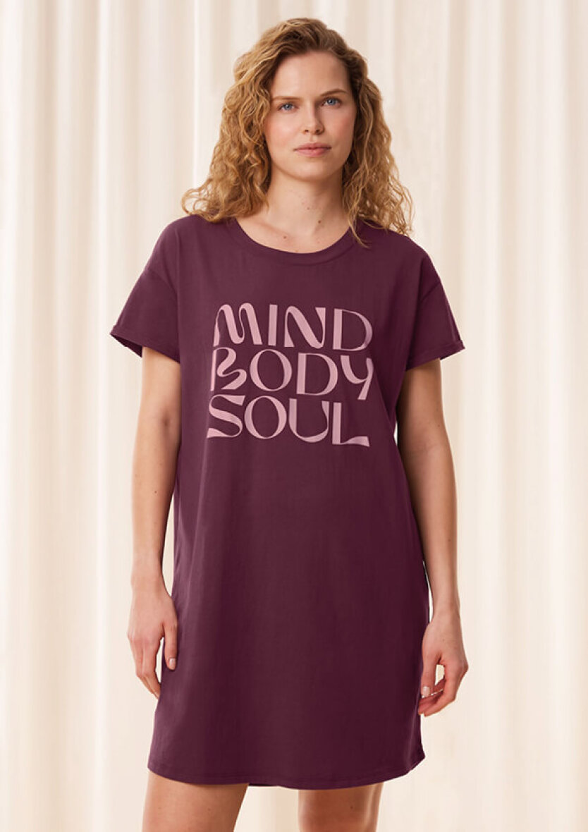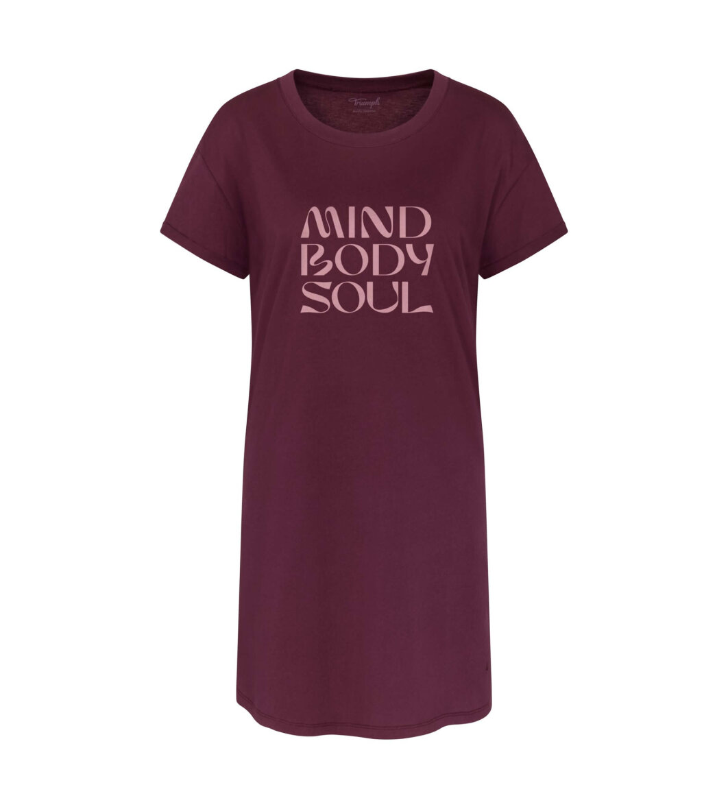 Bordeaux rød natkjole fra Triumph. Natkjolen er med skrift tryk på brystet med ordrene "Mind, body, soul ".
