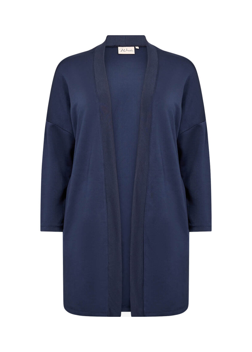 Fin lang cardigan fra Wasabiconcept i et flot navy design. Cardiganen er lavet i en lækker blød kvalitet, som er yderst behagelig at have på.