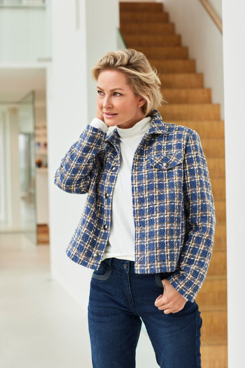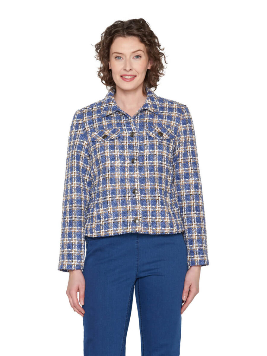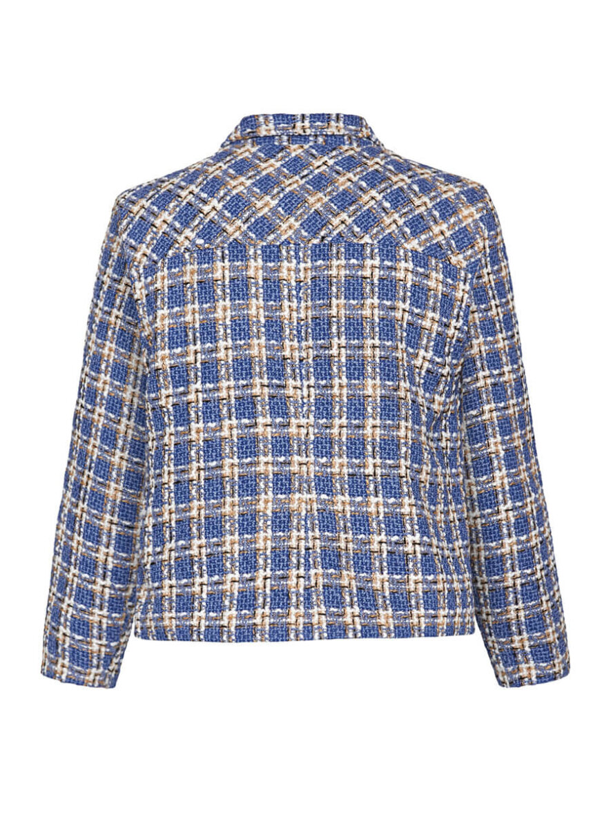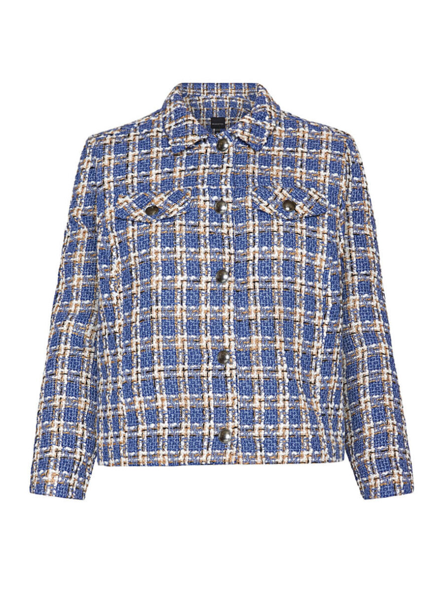 Flot og elegant kort jakke fra Brandtex. Jakken er lavet i et flot ternet design i blå, hvid og brun. Det ternede tråd design giver et flot og eksklusivt look.