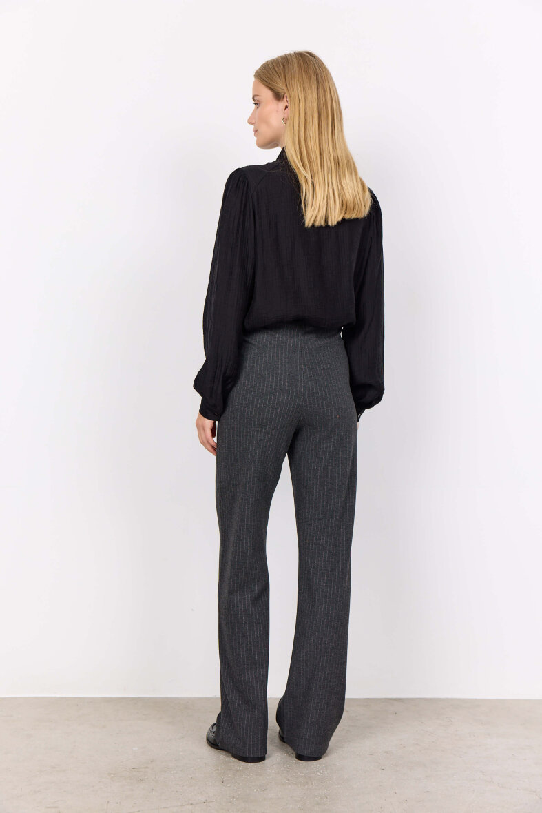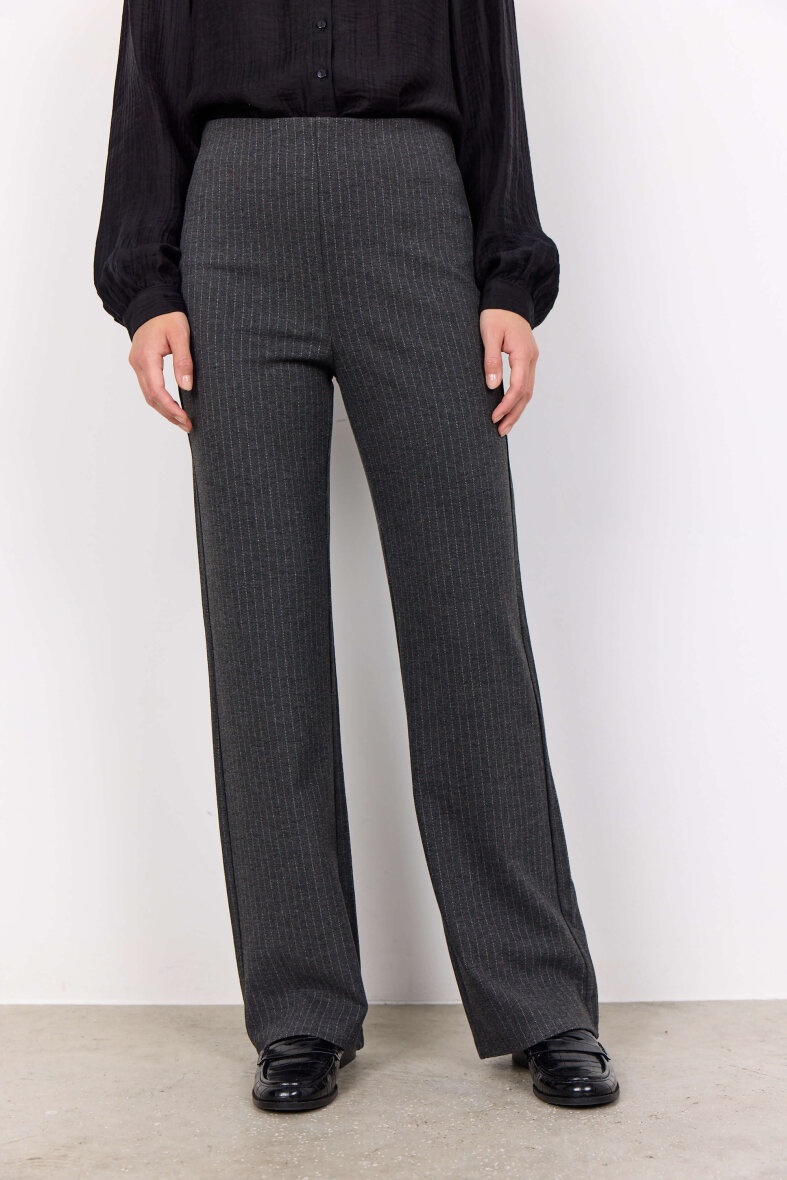 Komfortable bukser med let vidde i benene fra Soyaconcept. Buksen er lavet i et flot og klassisk gråt design med hvide nålestriber