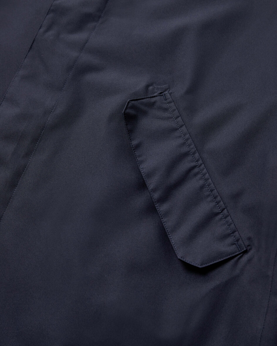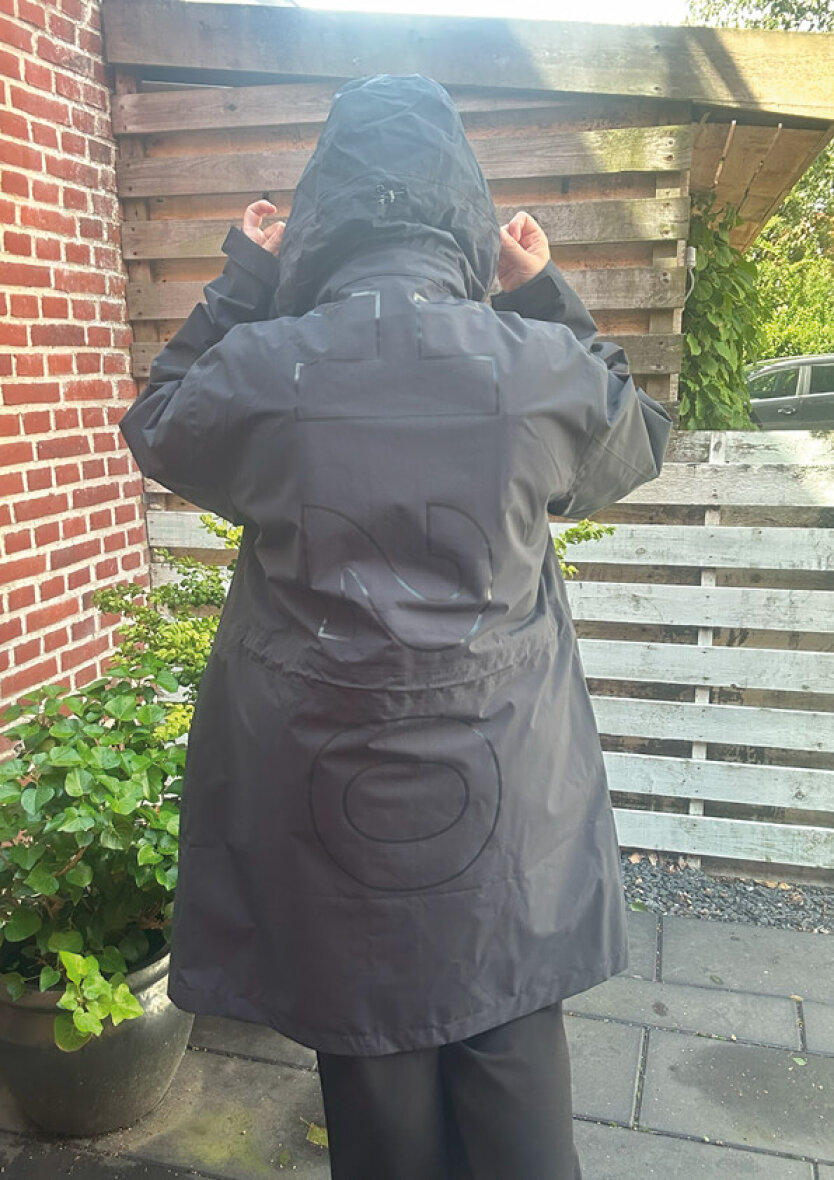 Regnjakken er let og lang og har indbygget hat, som let kan gemmes væk og tages frem. Hætten gemmes væk i en lille lynlåslomme ved kraven. I taljen sidder der en indvendig justerbar elastik, så du kan regulere pasformen i regnjakken, alt efter om du ønsker den løs eller med facon.