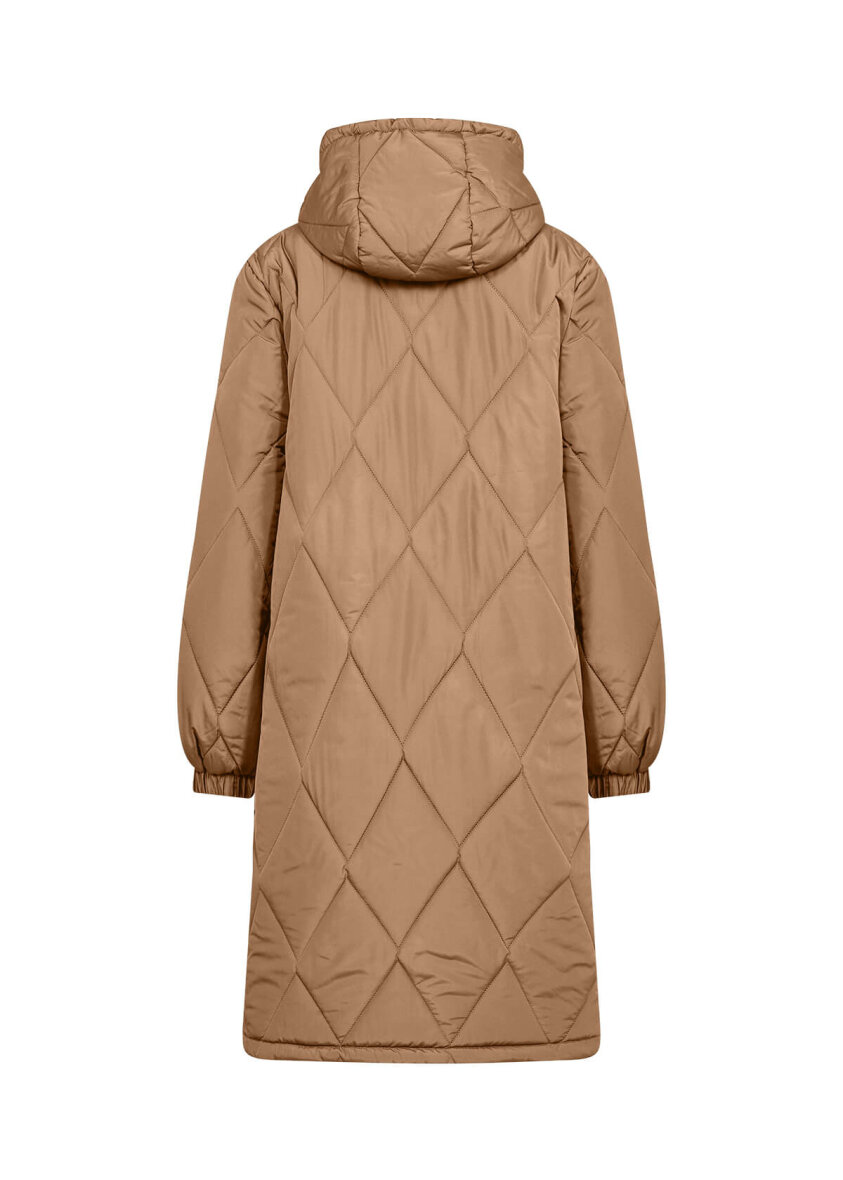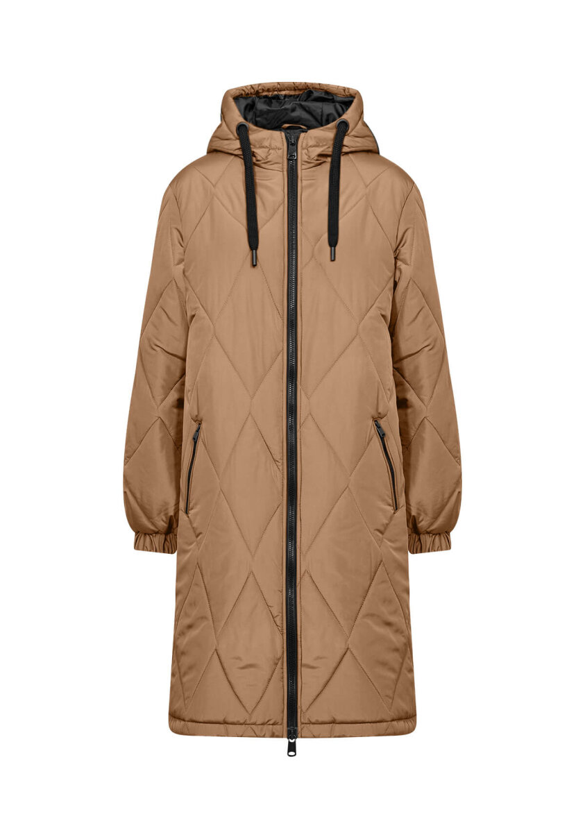 Lækker knælang Frakken fra Soyaconcept i en flot camel brun farve. Frakken er lavet i et quiltet design med sort linning, snøre og lynlås detaljer, hvilket giver et fedt look.