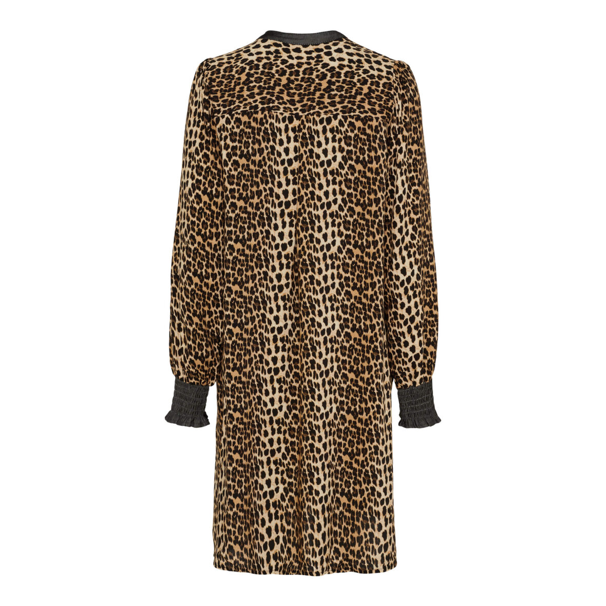 Denne smukke kjole er med rund hals og en lille v-halsudskæring, som afsluttes med en fin stolpeluk. Kjolen er med lange ærmer med bredt smock stykke ved håndleddet, som giver en flot effekt til ærmet. Kjolen er med skjulte lommer i siden.