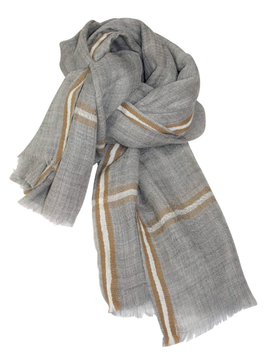Super blødt og lækkert tørklæde fra Mathlau. Striber i hvid og camel på lysegrå baggrund.