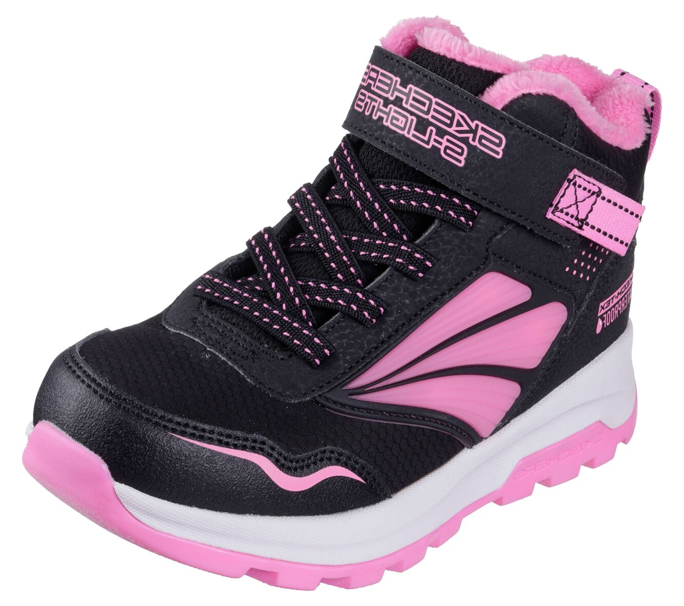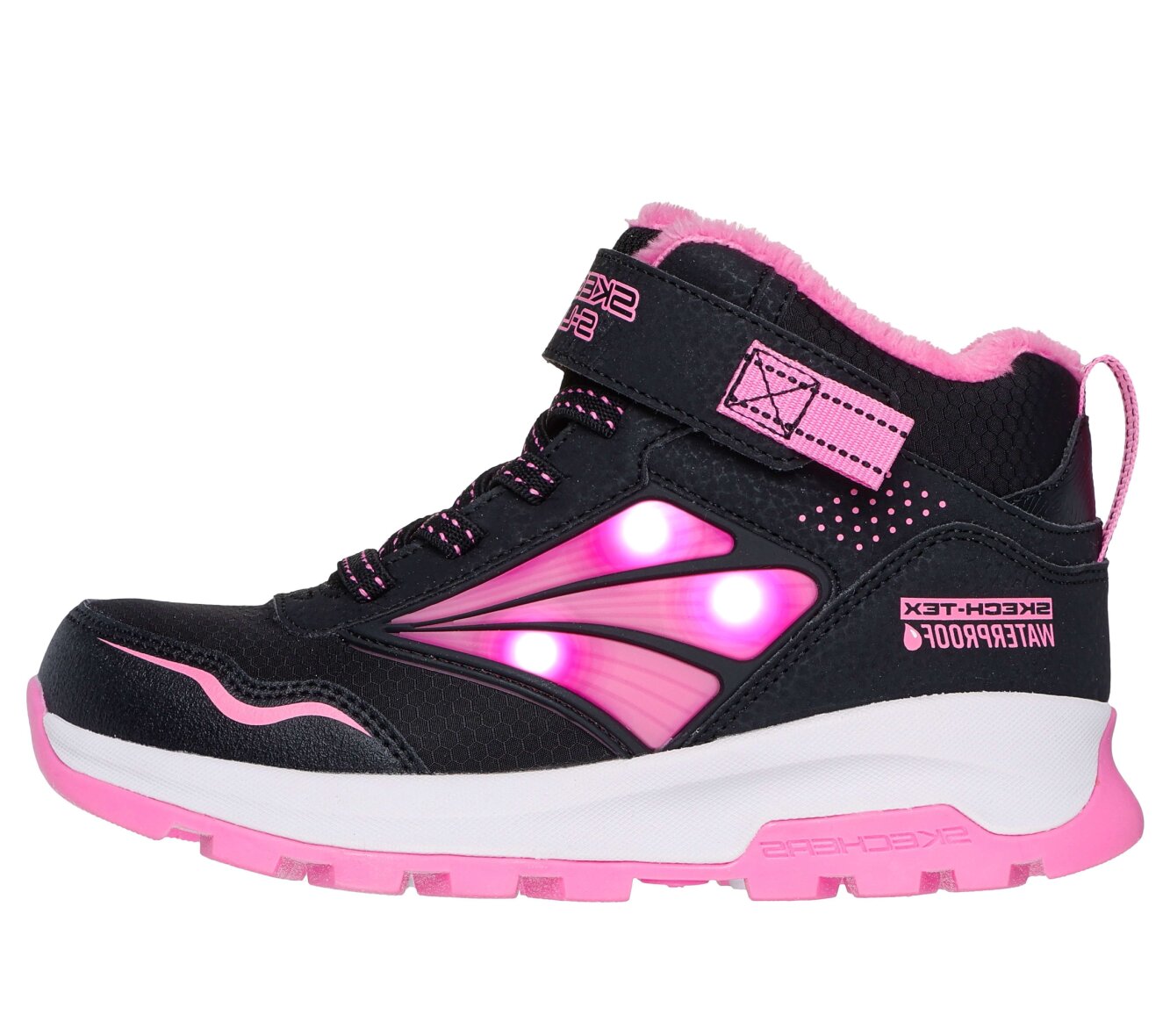Smarte og praktiske støvler med lys til piger fra Skechers i modellen Storm Blazer - Hydropolis - Waterproof. De smarte støvler er lavet i et fint sort og pink design med elastik snørebånd samt en justerbar velcrorem over vristen.