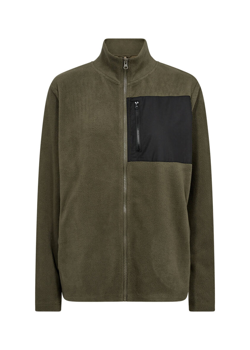 Smart og blød fleece jakke fra Soyaconcept i efterårets moderne army grønne farve. Jakken er med høj hals, lange ærmer og gennemgående lynlås. Denne model er lavet med en brystlomme med lynlås samt to skrå åbne lommer.