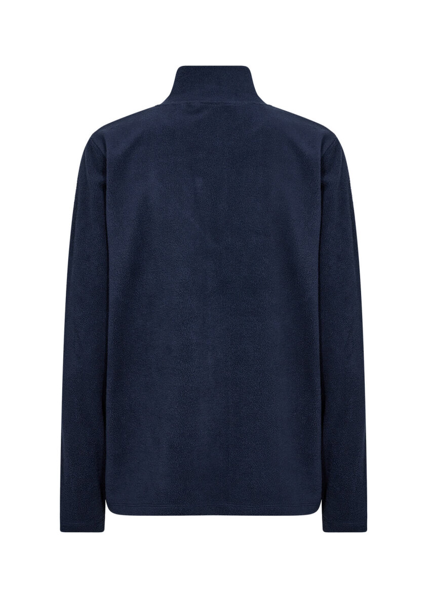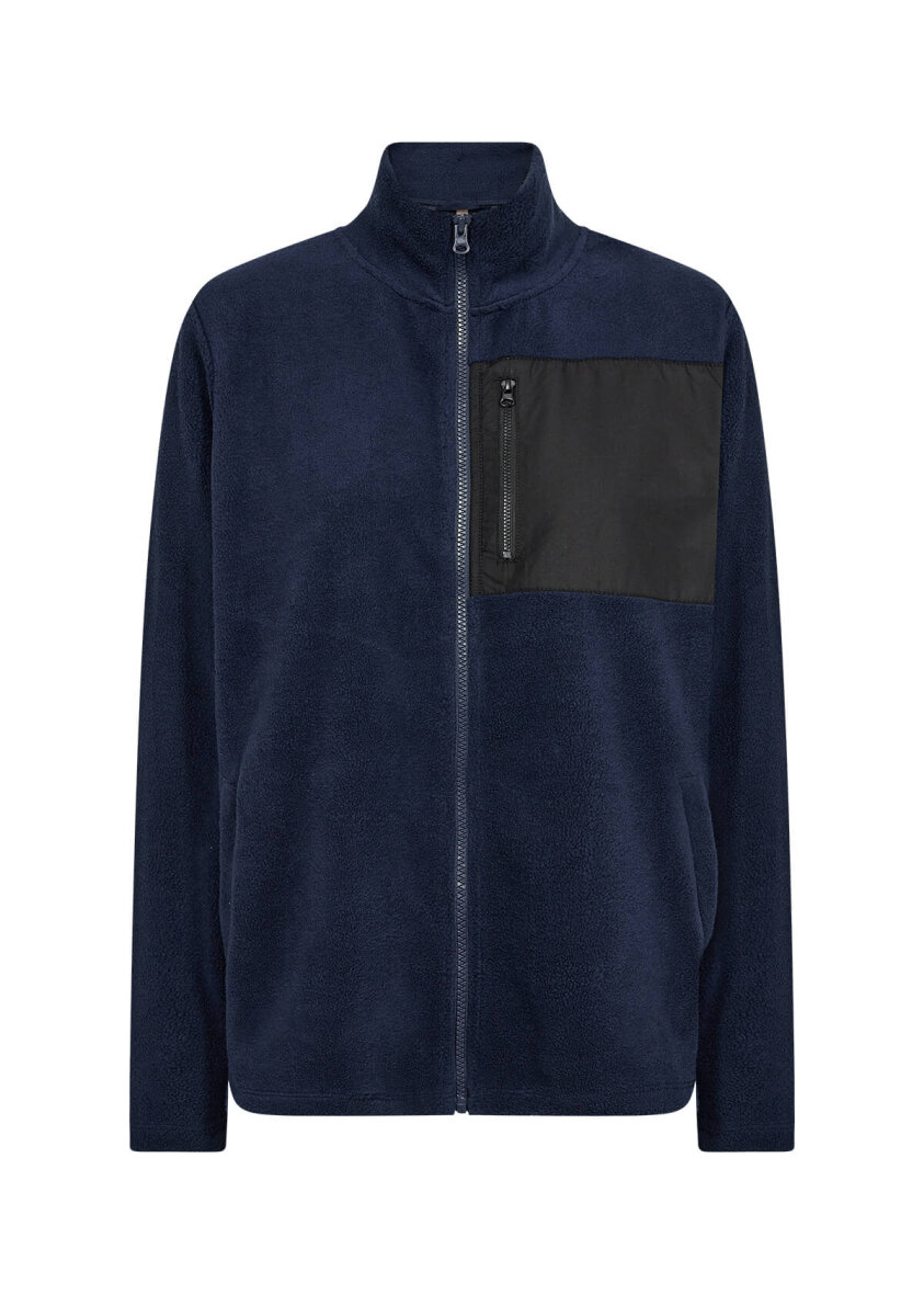 Smart og blød fleece jakke fra Soyaconcept i en moderne mørkeblå farve. Jakken er med høj hals, lange ærmer og gennemgående lynlås. Denne model er lavet med en brystlomme med lynlås samt to skrå åbne lommer.